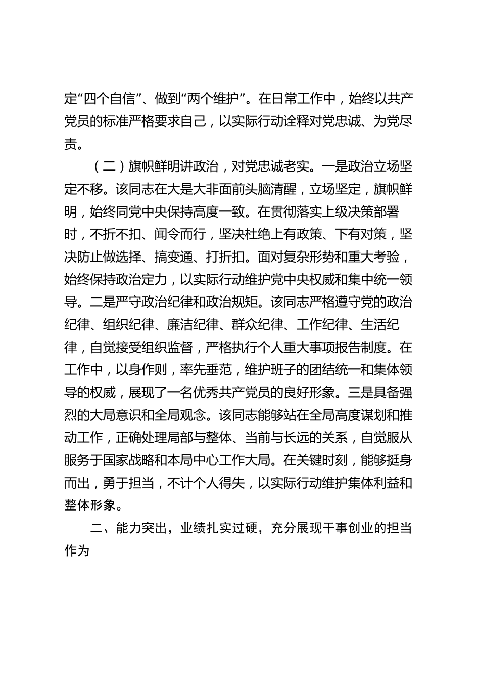 關(guān)于擬提拔任用人員的現(xiàn)實(shí)表現(xiàn)材料***同志,男,漢族,****年*月出生,****年*月參加工作,****年*月加入中國共黨,本科學(xué),任本局產(chǎn)歷現(xiàn)**科**職務(wù)。該同志政治立場堅(jiān)定,業(yè)務(wù)能力突出,工作作風(fēng)扎實(shí),清正廉潔,在干部群眾中享有良好聲譽(yù)。一、政治過硬,理論素養(yǎng)深厚,始終保持忠誠可靠的政治本色該同志始終把加強(qiáng)政治理論學(xué)習(xí)放在首位,以實(shí)際行動(dòng)堅(jiān)“”“”定擁護(hù)兩個(gè)確立、堅(jiān)決做到兩個(gè)維護(hù),在思想上政治上行動(dòng)上同以習(xí)近平同志為核心的黨中央保持高度一致。(一)堅(jiān)定理想信念,筑牢思想根基。一是系統(tǒng)深入學(xué)習(xí)黨的創(chuàng)新理論。該同志堅(jiān)持把學(xué)習(xí)習(xí)近平新時(shí)代中國特...