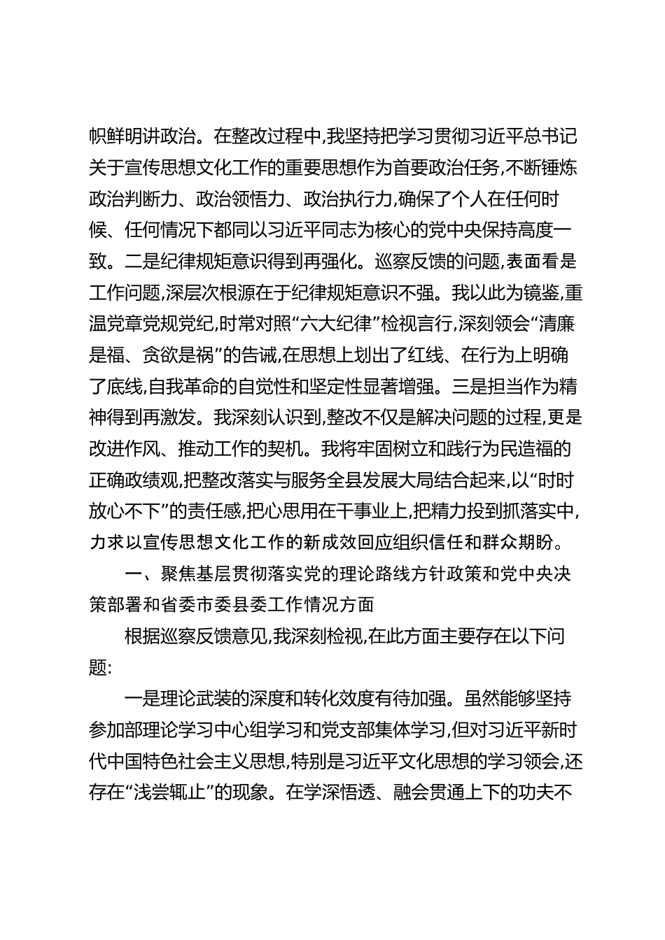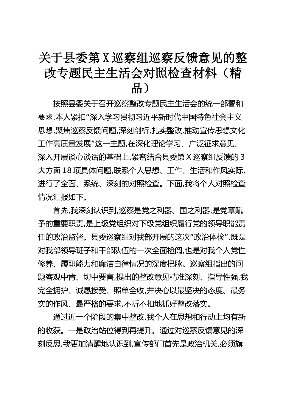 關(guān)于縣委第X巡察組巡察反饋意見的整改專題民主生活會對照檢查材料(精品)按照縣委關(guān)于召開巡察整改專題民主生活會的統(tǒng)一部署和要求,“本人緊扣深入學(xué)習(xí)貫徹習(xí)近平新時代中國特色社會主義思想,聚焦巡察反饋問題,深刻剖析,扎實整改,推動宣傳思想文化”工作高質(zhì)量發(fā)展這一主題,在深化理論學(xué)習(xí)、廣泛征求意見、深入開展談心談話的基礎(chǔ)上,緊密結(jié)合縣委第X巡察組反饋的3大方面18項具體問題,聯(lián)系個人思想、工作、生活和作風(fēng)實際,進(jìn)行了全面、系統(tǒng)、深刻的對照檢查。下面,我將個人對照檢查情況匯報如下。首先,我深刻認(rèn)識到,巡察是黨之利器、國之利器,是黨章賦予的重要職責(zé),是上...