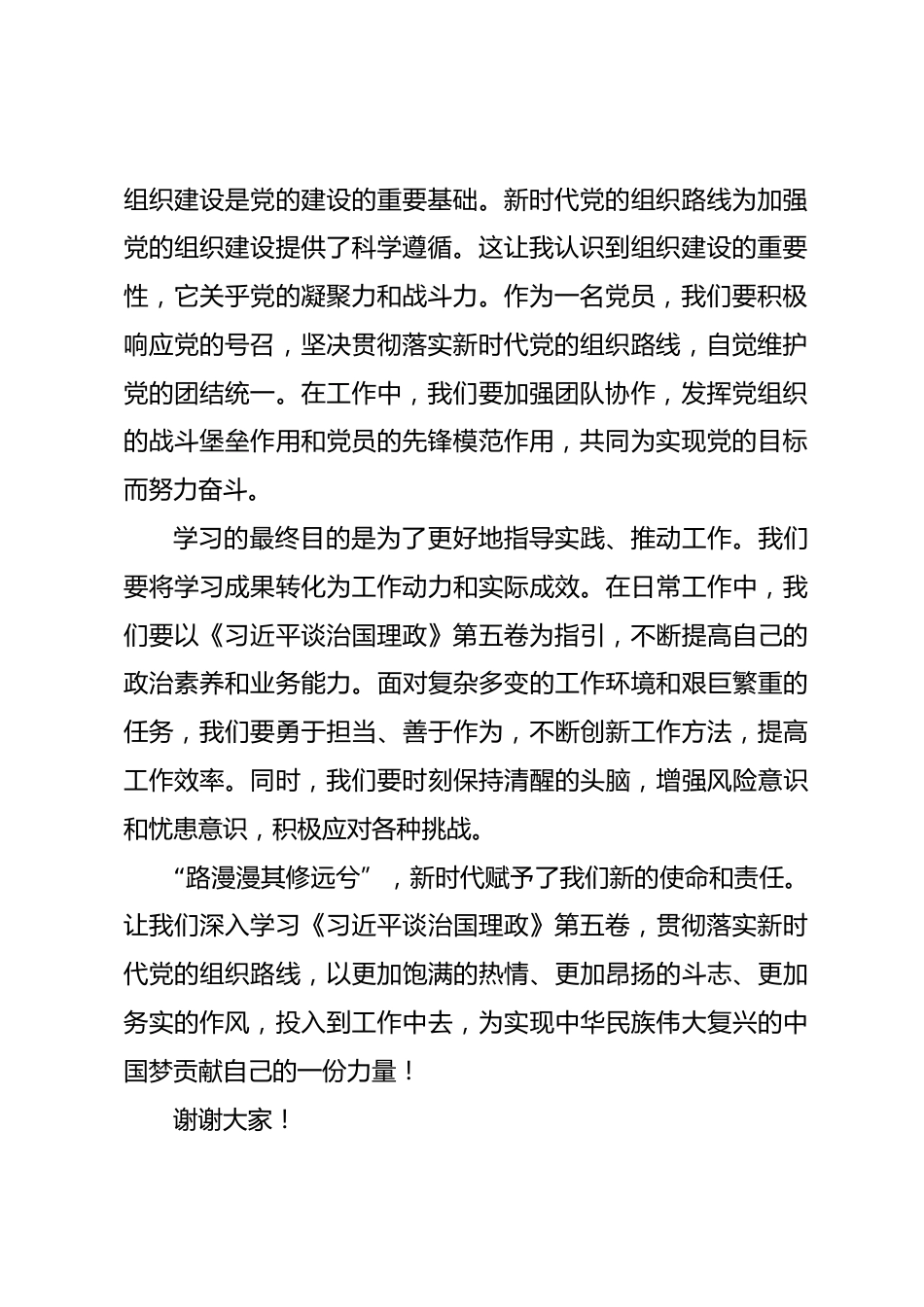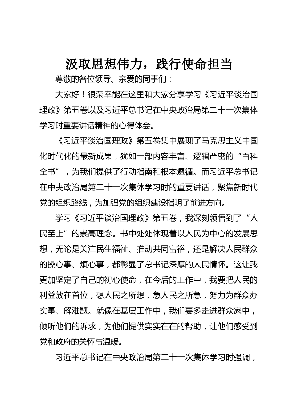 汲取思想偉力,踐行使命擔(dān)當(dāng)尊敬的各位領(lǐng)導(dǎo)、親愛的同事們:大家好!很榮幸能在這里和大家分享學(xué)習(xí)《習(xí)近平談治國(guó)理政》第五卷以及習(xí)近平總書記在中央政治局第二十一次集體學(xué)習(xí)時(shí)重要講話精神的心得體會(huì)?!读?xí)近平談治國(guó)理政》第五卷集中展現(xiàn)了馬克思主義中國(guó)化時(shí)代化的最新成果,猶如一部?jī)?nèi)容豐富、邏輯嚴(yán)密的“百科全書”,為我們提供了行動(dòng)指南和根本遵循。而習(xí)近平總書記在中央政治局第二十一次集體學(xué)習(xí)時(shí)的重要講話,聚焦新時(shí)代黨的組織路線,為加強(qiáng)黨的組織建設(shè)指明了前進(jìn)方向。學(xué)習(xí)《習(xí)近平談治國(guó)理政》第五卷,我深刻領(lǐng)悟到了“人民至上”的崇高理念。書中處處體...