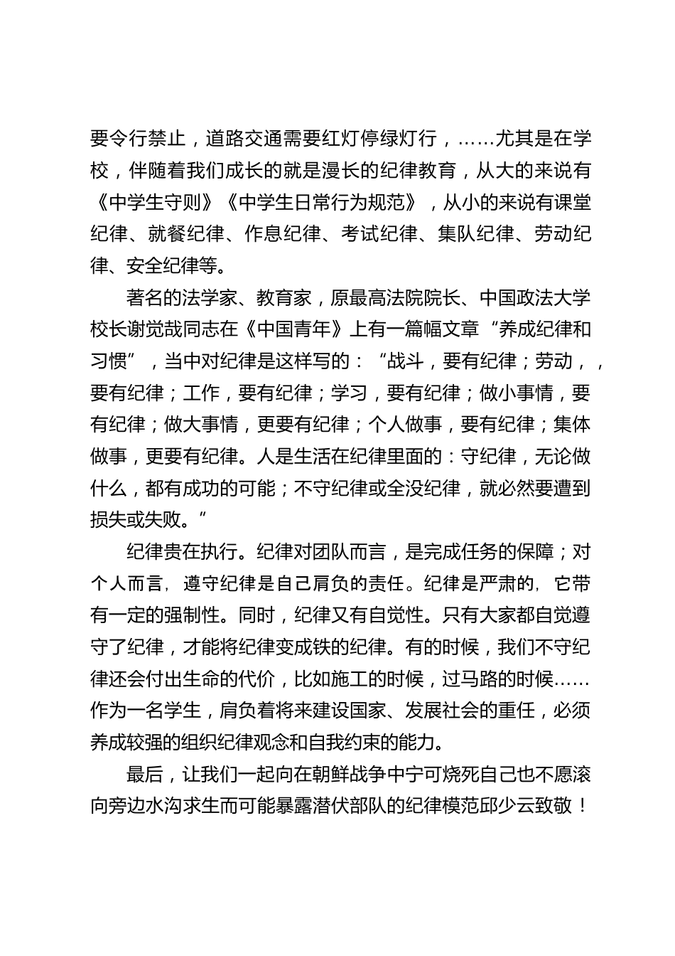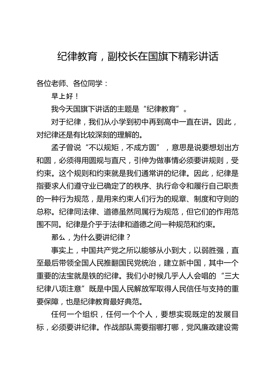 紀(jì)律教育,副校長在國旗下精彩講話各位老師、各位同學(xué):早上好!我今天國旗下講話的主題是“紀(jì)律教育”。對于紀(jì)律,我們從小學(xué)到初中再到高中一直在講。因此,對紀(jì)律還是有比較深刻的理解的。孟子曾說“不以規(guī)矩,不成方圓”,意思是說要想劃出方和圓,必須得用圓規(guī)與直尺,引伸為做事情必須要講規(guī)則,受約束。這個規(guī)則和約束就是我們通常講的紀(jì)律。因此,紀(jì)律是指要求人們遵守業(yè)已確定了的秩序、執(zhí)行命令和履行自己職責(zé)的一種行為規(guī)范,是用來約束人們行為的規(guī)章、制度和守則的總稱。紀(jì)律同法律、道德雖然同屬行為規(guī)范,但它們的作用范圍不同。紀(jì)律是介乎于法律和道德之...