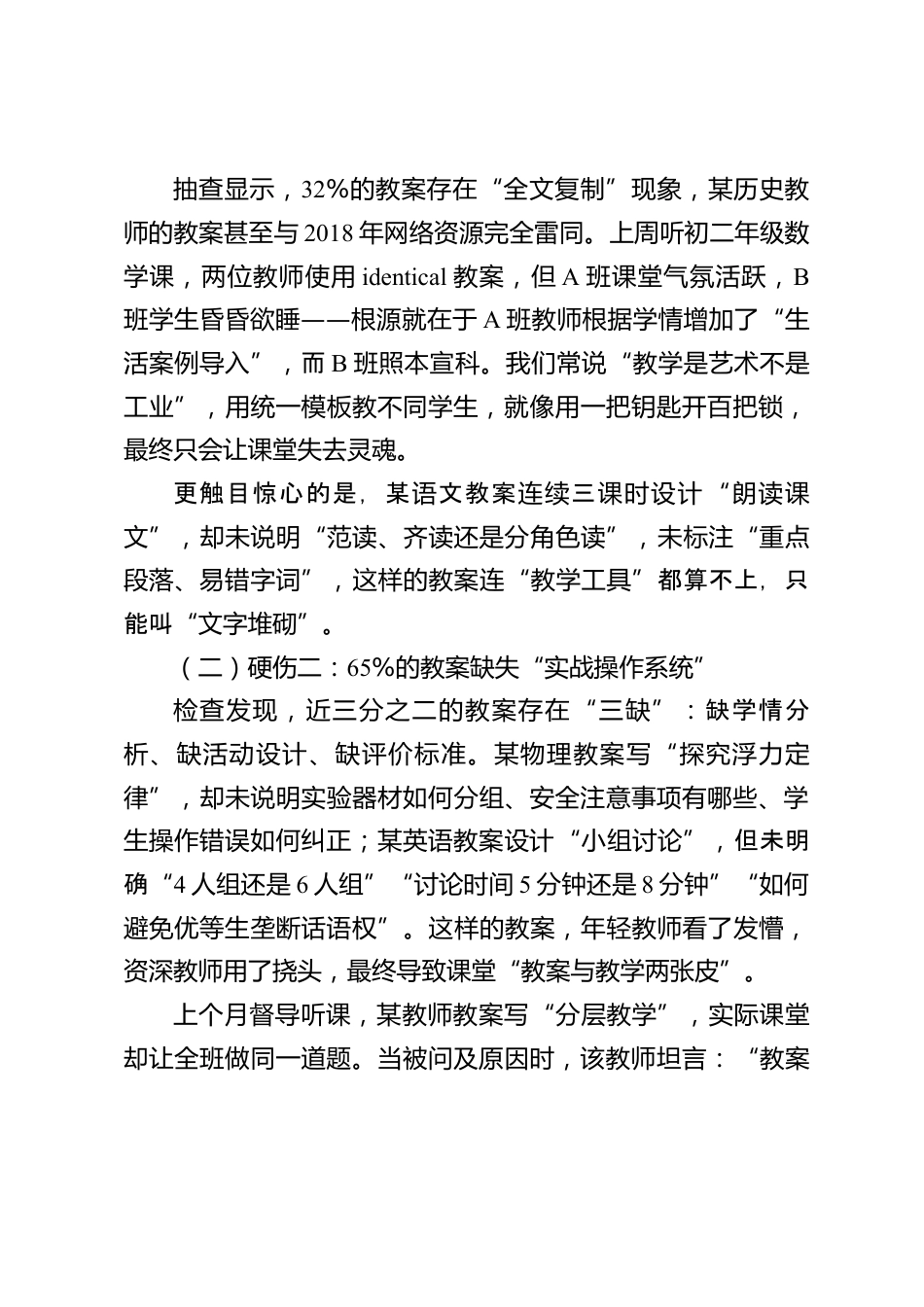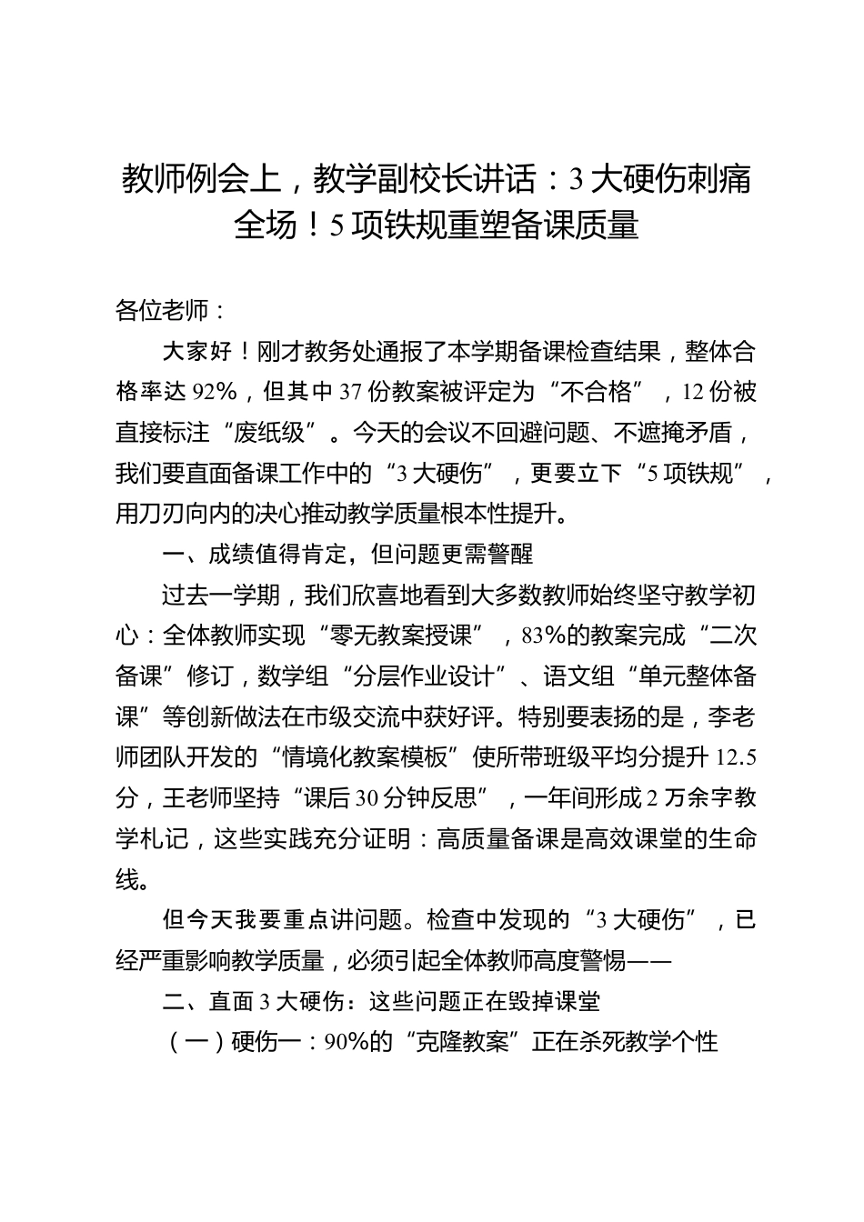 教師例會上,教學(xué)副校長講話:3大硬傷刺痛全場!5項鐵規(guī)重塑備課質(zhì)量各位老師:大家好!剛才教務(wù)處通報了本學(xué)期備課檢查結(jié)果,整體合格率達(dá)92%,但其中37份教案被評定為“不合格”,12份被直接標(biāo)注“廢紙級”。今天的會議不回避問題、不遮掩矛盾,我們要直面?zhèn)湔n工作中的“3大硬傷”,更要立下“5項鐵規(guī)”,用刀刃向內(nèi)的決心推動教學(xué)質(zhì)量根本性提升。一、成績值得肯定,但問題更需警醒過去一學(xué)期,我們欣喜地看到大多數(shù)教師始終堅守教學(xué)初心:全體教師實現(xiàn)“零無教案授課”,83%的教案完成“二次備課”修訂,數(shù)學(xué)組“分層作業(yè)設(shè)計”、語文組“單元整體備課”等創(chuàng)新做法在...