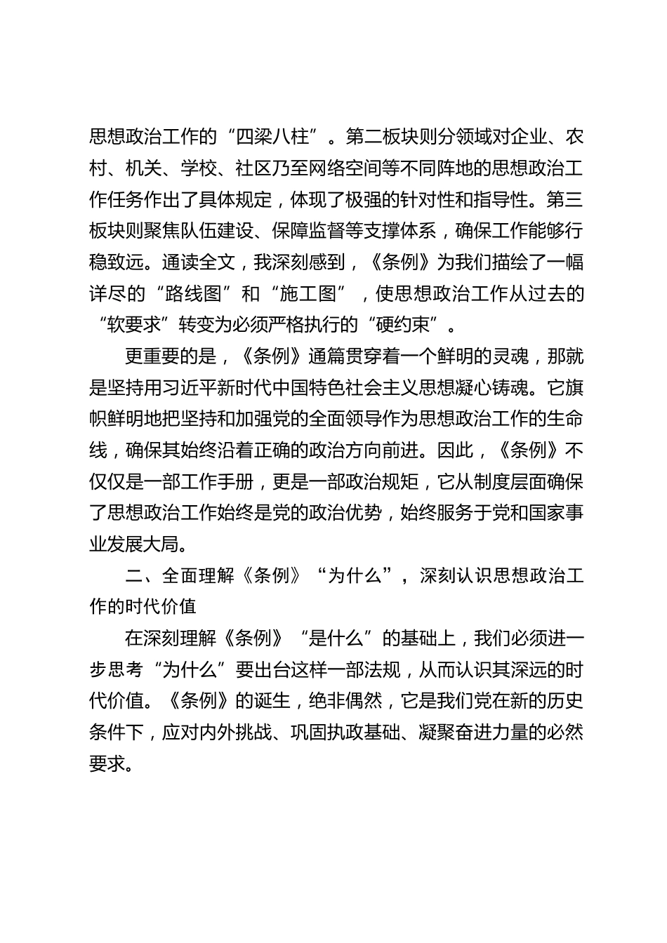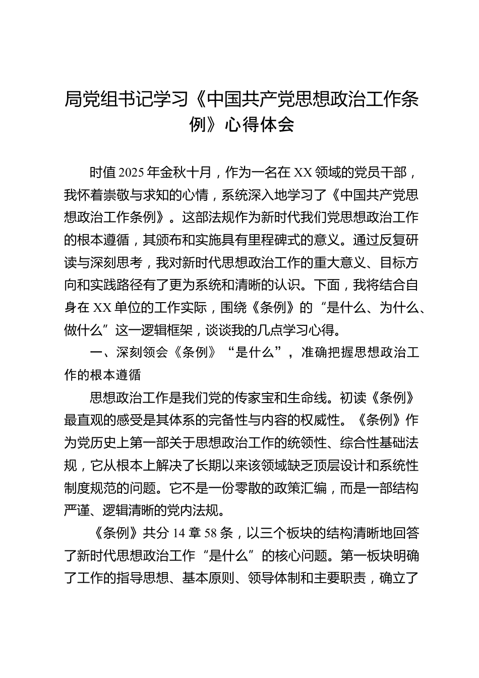 局黨組書記學(xué)習(xí)《中國(guó)共產(chǎn)黨思想政治工作條例》心得體會(huì)時(shí)值2025年金秋十月,作為一名在XX領(lǐng)域的黨員干部,我懷著崇敬與求知的心情,系統(tǒng)深入地學(xué)習(xí)了《中國(guó)共產(chǎn)黨思想政治工作條例》。這部法規(guī)作為新時(shí)代我們黨思想政治工作的根本遵循,其頒布和實(shí)施具有里程碑式的意義。通過反復(fù)研讀與深刻思考,我對(duì)新時(shí)代思想政治工作的重大意義、目標(biāo)方向和實(shí)踐路徑有了更為系統(tǒng)和清晰的認(rèn)識(shí)。下面,我將結(jié)合自身在XX單位的工作實(shí)際,圍繞《條例》的“是什么、為什么、做什么”這一邏輯框架,談?wù)勎业膸c(diǎn)學(xué)習(xí)心得。一、深刻領(lǐng)會(huì)《條例》“是什么”,準(zhǔn)確把握思想政治工作的根本遵循...