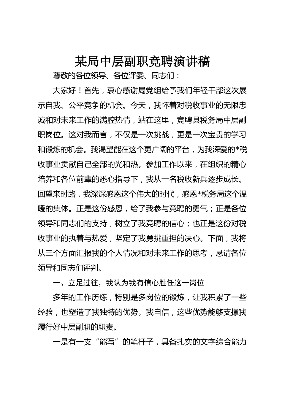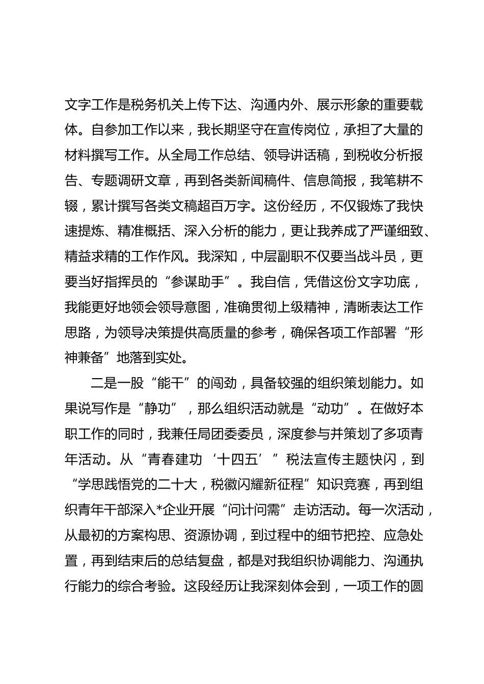 某局中層副職競聘演講稿尊敬的各位領(lǐng)導(dǎo)、各位評(píng)委、同志們:大家好!首先,衷心感謝局黨組給予我們年輕干部這次展示自我、公平競爭的機(jī)會(huì)。今天,我懷著對(duì)稅收事業(yè)的無限忠誠和對(duì)未來工作的滿腔熱情,站在這里,競聘縣稅務(wù)局中層副職崗位。這對(duì)我而言,不僅是一次挑戰(zhàn),更是一次寶貴的學(xué)習(xí)和鍛煉的機(jī)會(huì)。我渴望能在這個(gè)更廣闊的平臺(tái),為我深愛的*稅收事業(yè)貢獻(xiàn)自己全部的光和熱。參加工作以來,在組織的精心培養(yǎng)和各位前輩的悉心指導(dǎo)下,我從一名稅收新兵逐步成長?;赝麃頃r(shí)路,我深深感恩這個(gè)偉大的時(shí)代,感恩*稅務(wù)局這個(gè)溫暖的集體。正是這份感恩,給了我參與競聘的勇氣...