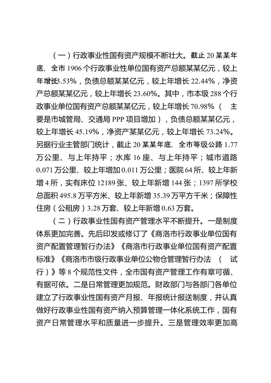 某某市關(guān)于行政事業(yè)性國(guó)有資產(chǎn)管理情況的調(diào)研報(bào)告行政事業(yè)性國(guó)有資產(chǎn)是由行政事業(yè)單位占有使用、在法律上確認(rèn)國(guó)家所有、能以貨幣計(jì)量的各種經(jīng)濟(jì)資源的總和,它包括各級(jí)各類行政事業(yè)單位占有使用的流動(dòng)資產(chǎn)、固定資產(chǎn)和公共基礎(chǔ)設(shè)施、保障性住房等國(guó)有資產(chǎn),是黨和國(guó)家事業(yè)發(fā)展的物質(zhì)基礎(chǔ)和重要保障。加強(qiáng)行政事業(yè)性國(guó)有資產(chǎn)的管理,對(duì)于保護(hù)國(guó)家財(cái)產(chǎn)的安全和完整、保證行政事業(yè)任務(wù)的完成和事業(yè)計(jì)劃的實(shí)現(xiàn)、節(jié)約國(guó)家資金等方面都具有十分重要的作用。為全面了解我市行政事業(yè)性國(guó)有資產(chǎn)管理情況,近期,我們采取實(shí)地察看走訪、召開(kāi)座談會(huì)和查閱資料等方式,對(duì)我市行政事業(yè)...