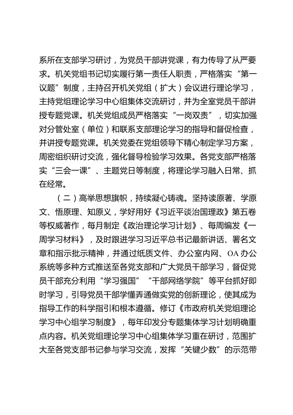 某某市政府辦公室黨組關(guān)于思想政治建設(shè)工作情況的報(bào)告今年以來(lái),市政府辦公室黨組始終以黨的政治建設(shè)為統(tǒng)領(lǐng),堅(jiān)持不懈用習(xí)近平新時(shí)代中國(guó)特色社會(huì)主義思想凝心鑄魂,深入學(xué)習(xí)貫徹習(xí)近平總書(shū)記關(guān)于辦公室工作的重要指示批示精神,持續(xù)深化理論武裝,勇于擔(dān)當(dāng)作為,自覺(jué)把落實(shí)習(xí)近平總書(shū)記重要指示批示作為首要政治任務(wù),不折不扣推動(dòng)落實(shí)落地。一、主要工作情況(一)堅(jiān)持以上率下,加強(qiáng)示范引領(lǐng)。始終把學(xué)懂弄通做實(shí)習(xí)近平新時(shí)代中國(guó)特色社會(huì)主義思想作為首修課、必修課、終身課,把習(xí)近平總書(shū)記重要指示批示作為總綱領(lǐng)、總遵循、總指引,把貫徹落實(shí)習(xí)近平總書(shū)記在考察時(shí)...
