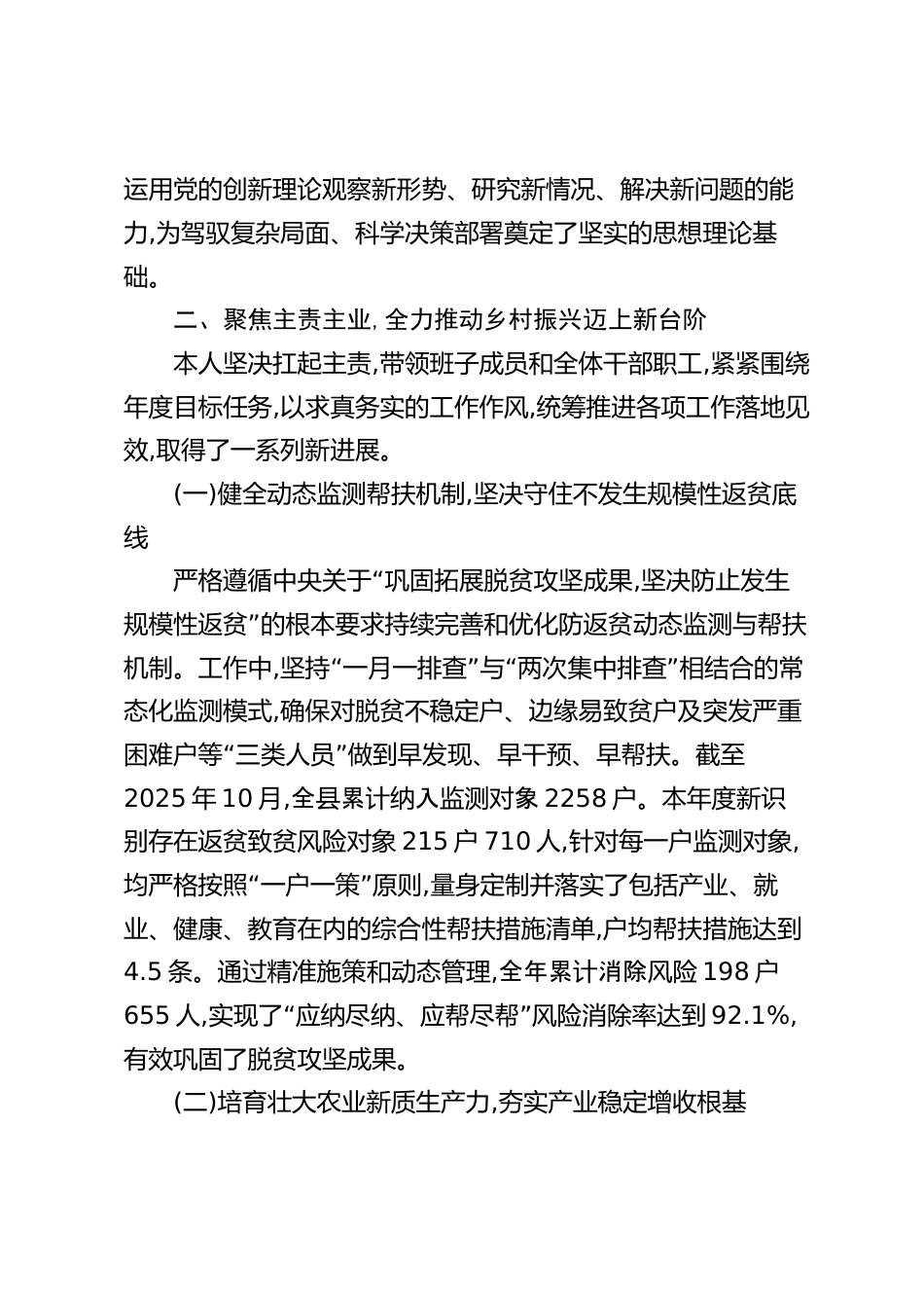 農(nóng)業(yè)局局長(zhǎng)2025年度個(gè)人述職述廉報(bào)告根據(jù)組織要求,現(xiàn)將本人2025年度在履行崗位職責(zé)、加強(qiáng)黨風(fēng)廉政建設(shè)及學(xué)法用法等方面的具體情況報(bào)告如下。一、深化理論武裝,筑牢政治忠誠(chéng)之基始終將強(qiáng)化思想政治建設(shè)置于首位,堅(jiān)持以學(xué)固本、以學(xué)鑄魂、以學(xué)增智、以學(xué)正風(fēng)。一年來(lái),本人深入學(xué)習(xí)貫徹習(xí)近平新時(shí)代中國(guó)特色社會(huì)主義思想、黨的二十大和二十屆三中、四中全會(huì)精神,并緊密結(jié)合鄉(xiāng)村振興工作實(shí)際,將學(xué)習(xí)貫徹習(xí)近平總書“”記關(guān)于三農(nóng)工作的重要論述和重要指示批示精神作為核心任務(wù)。特別是,本人對(duì)2025年2月發(fā)布的《中共中央國(guó)務(wù)院關(guān)于進(jìn)一步深化農(nóng)村改革扎實(shí)推進(jìn)鄉(xiāng)村全面振興的意...