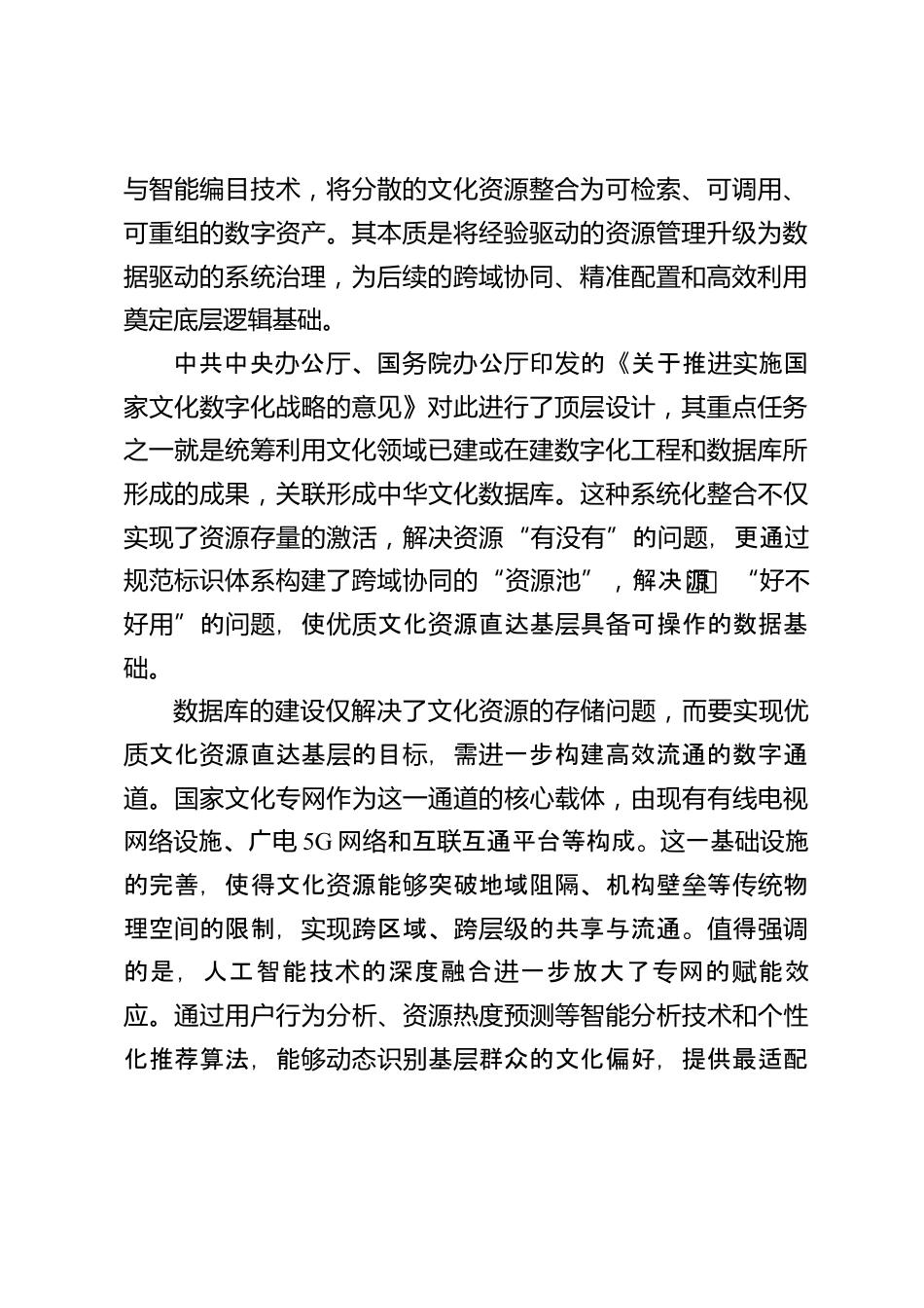 數(shù)字化賦能優(yōu)質(zhì)文化資源直達(dá)基層黨的二十屆三中全會(huì)提出,“完善公共文化服務(wù)體系,建立優(yōu)質(zhì)文化資源直達(dá)基層機(jī)制”,為提升公共文化服務(wù)水平提供了遵循。習(xí)近平總書記在主持二十屆中央政治局第十七次集體學(xué)習(xí)時(shí)強(qiáng)調(diào)“探索文化和科技融合的有效機(jī)制,實(shí)現(xiàn)文化建設(shè)數(shù)字化賦能、信息化轉(zhuǎn)型”。通過數(shù)字技術(shù)重構(gòu)文化資源的組織方式、分配邏輯與觸達(dá)形態(tài),有利于破解文化資源下沉難題。國務(wù)院辦公廳印發(fā)的《關(guān)于推動(dòng)文化高質(zhì)量發(fā)展的若干經(jīng)濟(jì)政策》,為優(yōu)文化源直達(dá)基提供了政策保障。在推數(shù)字國建與質(zhì)資層進(jìn)強(qiáng)設(shè)文化國建的背景下,以數(shù)字化能文化源直達(dá)基強(qiáng)設(shè)賦優(yōu)質(zhì)資層,成...