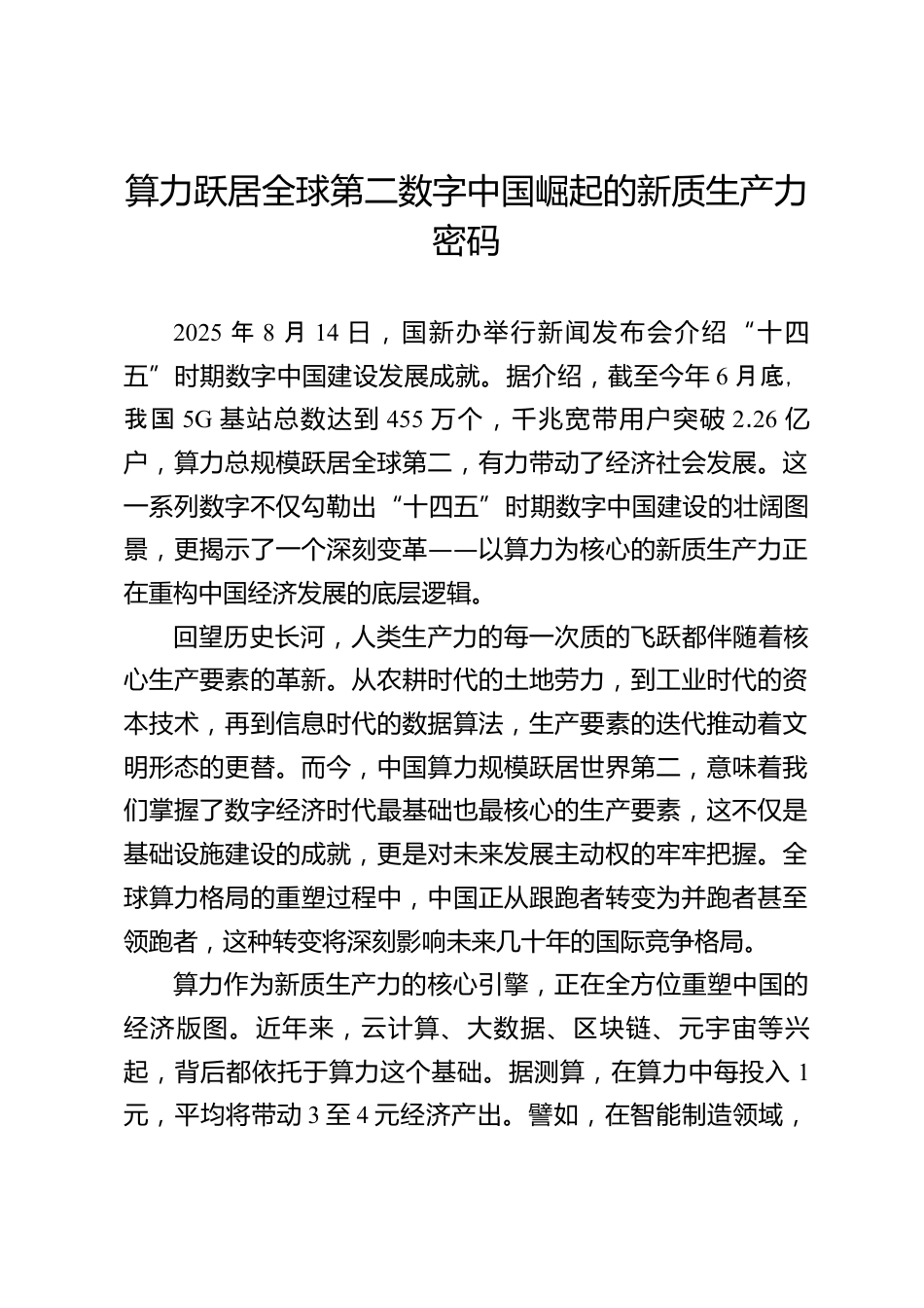算力躍居全球第二數(shù)字中國崛起的新質(zhì)生產(chǎn)力密碼2025年8月14日,國新辦舉行新聞發(fā)布會介紹“十四五”時期數(shù)字中國建設(shè)發(fā)展成就。據(jù)介紹,截至今年6月底,我國5G基站總數(shù)達(dá)到455萬個,千兆寬帶用戶突破2.26億戶,算力總規(guī)模躍居全球第二,有力帶動了經(jīng)濟(jì)社會發(fā)展。這一系列數(shù)字不僅勾勒出“十四五”時期數(shù)字中國建設(shè)的壯闊圖景,更揭示了一個深刻變革——以算力為核心的新質(zhì)生產(chǎn)力正在重構(gòu)中國經(jīng)濟(jì)發(fā)展的底層邏輯?;赝麣v史長河,人類生產(chǎn)力的每一次質(zhì)的飛躍都伴隨著核心生產(chǎn)要素的革新。從農(nóng)耕時代的土地勞力,到工業(yè)時代的資本技術(shù),再到信息時代的數(shù)據(jù)算法,生產(chǎn)要素的...