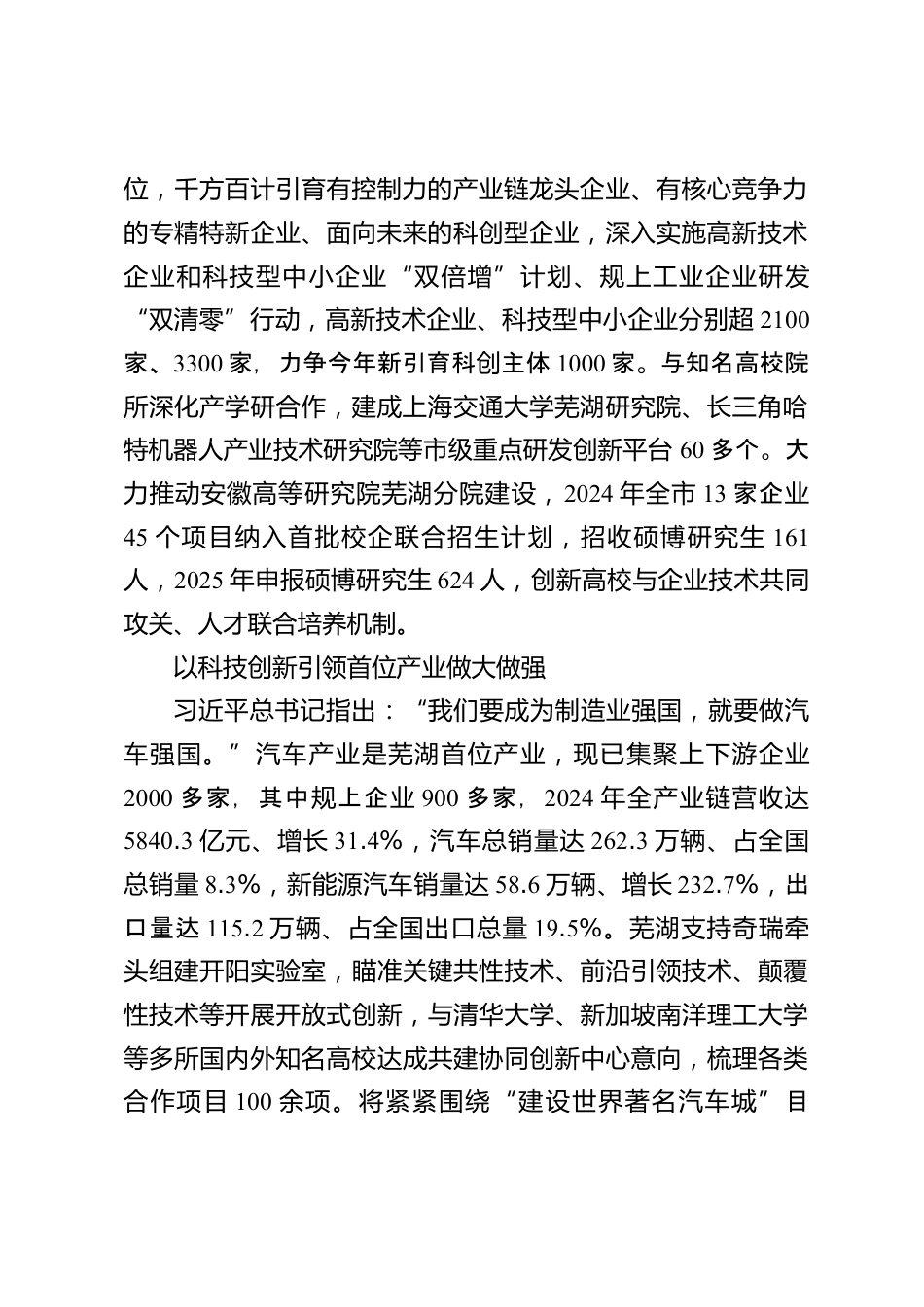 推動(dòng)科技創(chuàng)新和產(chǎn)業(yè)創(chuàng)新深度融合因地制宜培育壯大新質(zhì)生產(chǎn)力黨的十八大以來(lái),習(xí)近平總書記三次親臨安徽考察,重點(diǎn)聚焦科技創(chuàng)新,勉勵(lì)安徽?qǐng)?jiān)定不移下好創(chuàng)新“先手棋”,在科技創(chuàng)新和產(chǎn)業(yè)創(chuàng)新上走在前列。蕪湖市牢記習(xí)近平總書記殷殷囑托,圍繞產(chǎn)業(yè)鏈部署創(chuàng)新鏈、圍繞創(chuàng)新鏈布局產(chǎn)業(yè)鏈,加快構(gòu)建以先進(jìn)制造業(yè)為支撐的現(xiàn)代化產(chǎn)業(yè)體系,因地制宜培育壯大新質(zhì)生產(chǎn)力,推動(dòng)高質(zhì)量發(fā)展邁出堅(jiān)實(shí)步伐。2024年,蕪湖市實(shí)現(xiàn)地區(qū)生產(chǎn)總值5120.5億元,經(jīng)濟(jì)增速6.4%,全社會(huì)研發(fā)經(jīng)費(fèi)投入占GDP比重達(dá)4.28%、居安徽首位,其中90%以上的研發(fā)投入來(lái)自企業(yè)。以“鳩茲科創(chuàng)灣”為抓手營(yíng)造更具...