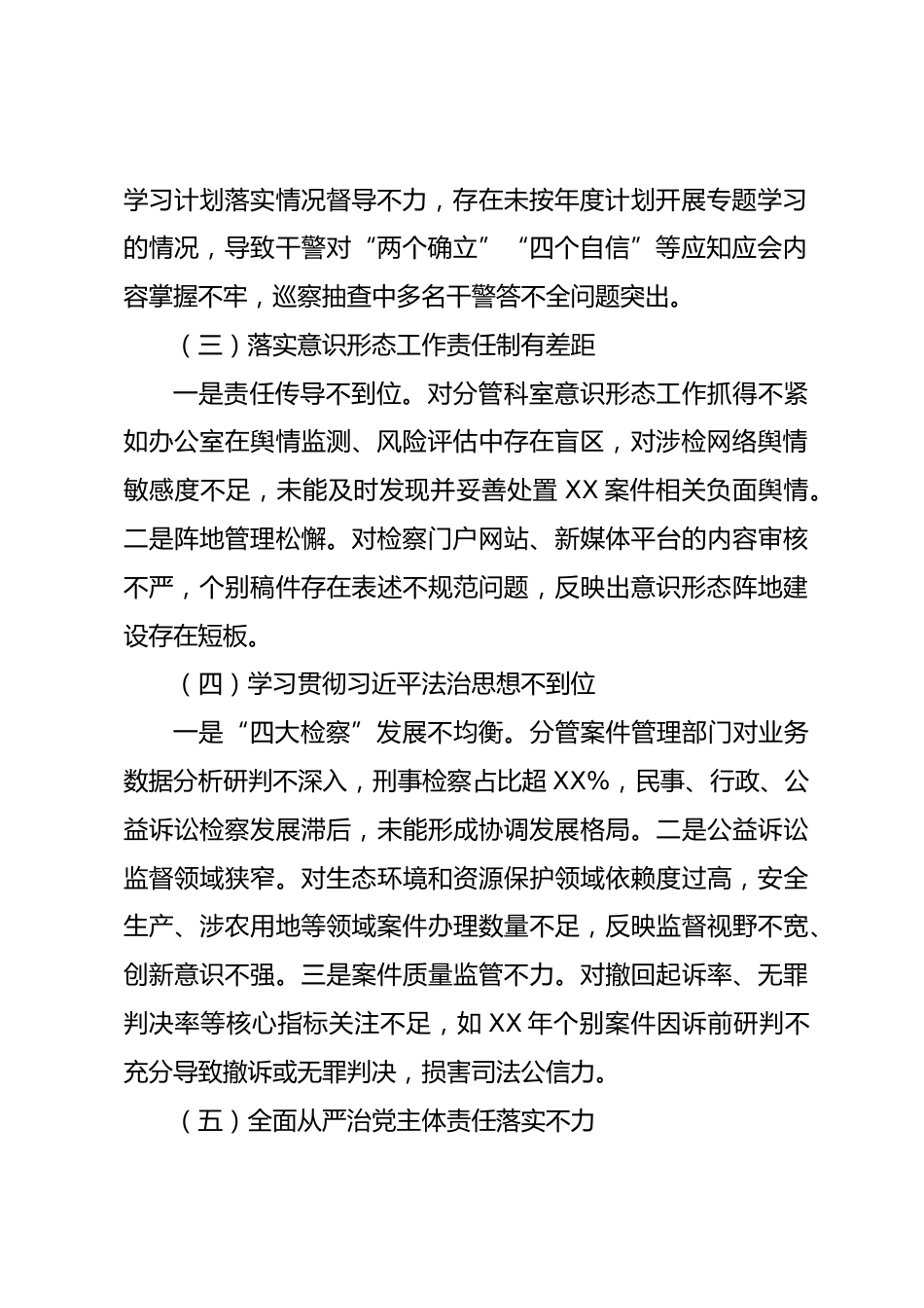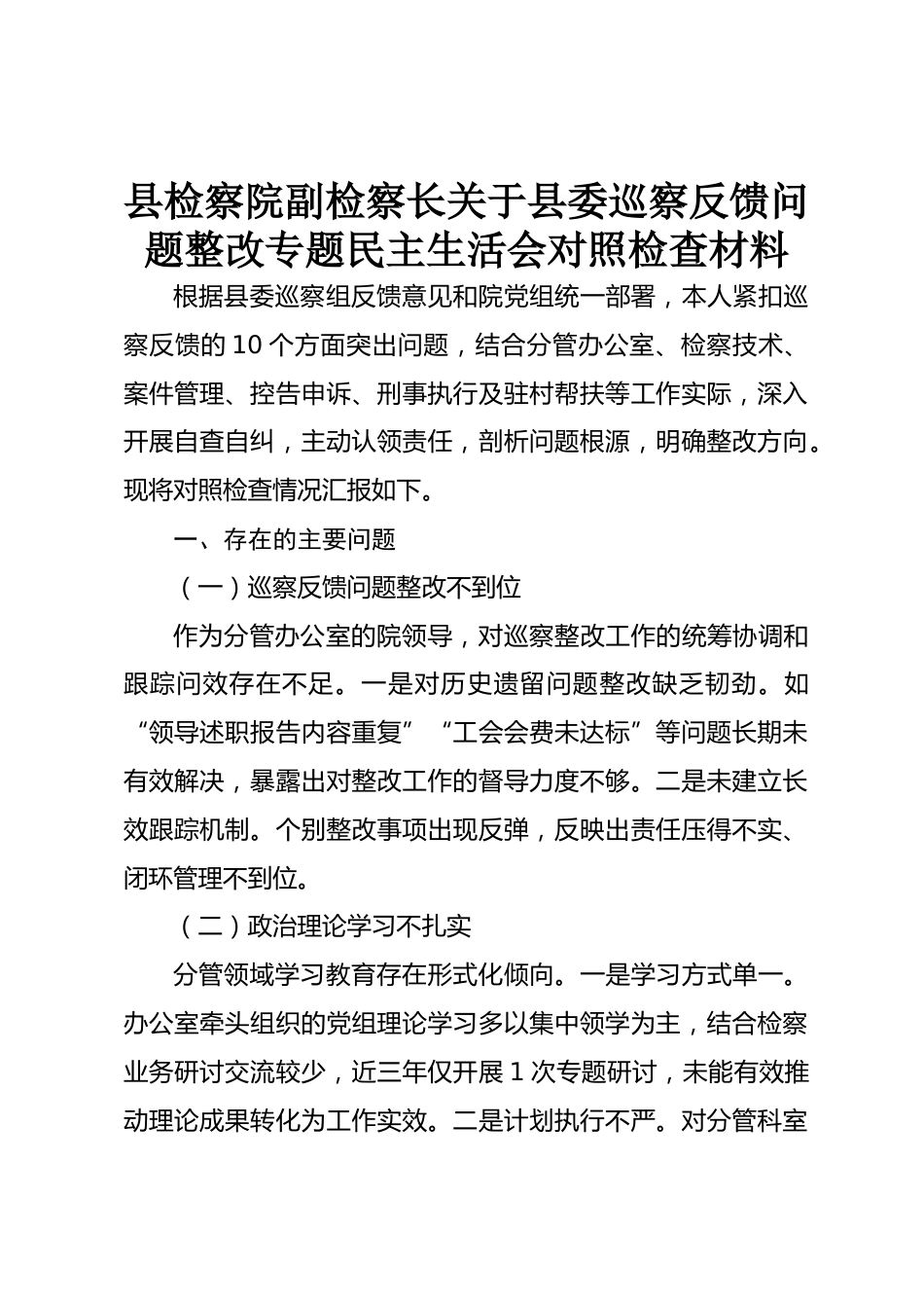 縣檢察院副檢察長關(guān)于縣委巡察反饋問題整改專題民主生活會(huì)對照檢查材料根據(jù)縣委巡察組反饋意見和院黨組統(tǒng)一部署,本人緊扣巡察反饋的10個(gè)方面突出問題,結(jié)合分管辦公室、檢察技術(shù)、案件管理、控告申訴、刑事執(zhí)行及駐村幫扶等工作實(shí)際,深入開展自查自糾,主動(dòng)認(rèn)領(lǐng)責(zé)任,剖析問題根源,明確整改方向?,F(xiàn)將對照檢查情況匯報(bào)如下。一、存在的主要問題(一)巡察反饋問題整改不到位作為分管辦公室的院領(lǐng)導(dǎo),對巡察整改工作的統(tǒng)籌協(xié)調(diào)和跟蹤問效存在不足。一是對歷史遺留問題整改缺乏韌勁。如“領(lǐng)導(dǎo)述職報(bào)告內(nèi)容重復(fù)”“工會(huì)會(huì)費(fèi)未達(dá)標(biāo)”等問題長期未有效解決,暴露出對整改工...