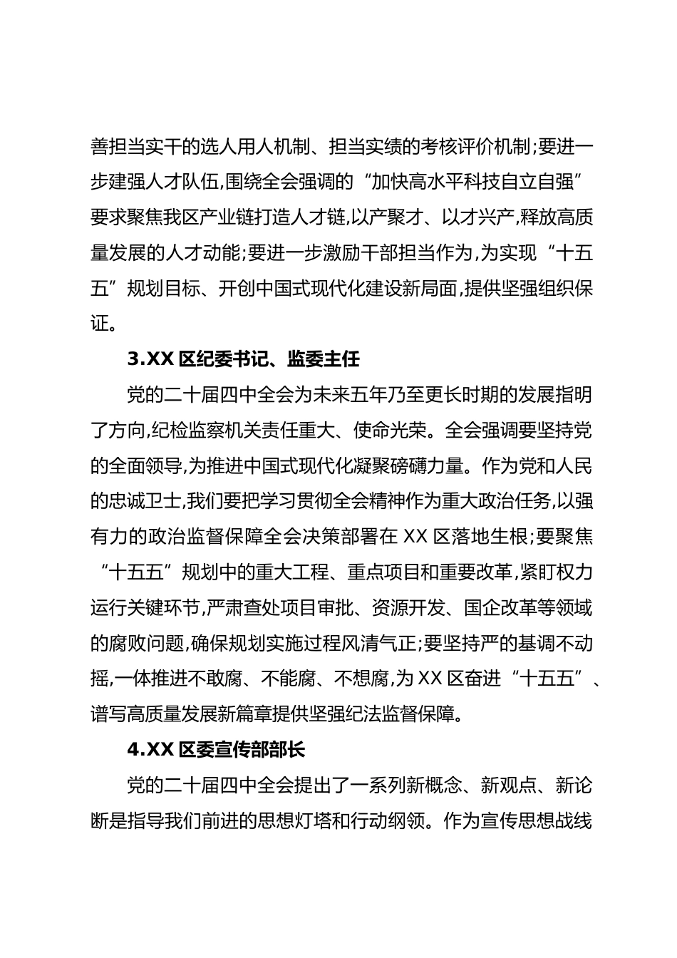 縣區(qū)黨的二十屆四中全會(huì)精神熱議文案匯編(精品)1.XX區(qū)委書記黨的二十屆四中全會(huì)擘畫了“十五五”的宏偉發(fā)展藍(lán)圖,會(huì)議部署審時(shí)度勢(shì)、高屋建瓴,讓人振奮不已。要先學(xué)先行,領(lǐng)會(huì)要義,認(rèn)真學(xué)習(xí)全會(huì)精神,充分認(rèn)識(shí)全會(huì)重大意義,準(zhǔn)確把握“十五五”國民經(jīng)濟(jì)和社會(huì)發(fā)展各項(xiàng)目標(biāo)任務(wù),準(zhǔn)確把握高質(zhì)量發(fā)展的主題和改革創(chuàng)新的根本動(dòng)力,準(zhǔn)確把握全面建成社會(huì)主義現(xiàn)代化強(qiáng)國、實(shí)現(xiàn)第二個(gè)百年奮斗目標(biāo);要結(jié)合實(shí)際,做好謀劃,緊密結(jié)合XX區(qū)工作實(shí)際,認(rèn)真研究制定我區(qū)“十五五”規(guī)劃,凝聚全區(qū)力量,聚焦全會(huì)提出的建設(shè)現(xiàn)代化產(chǎn)業(yè)體系、推進(jìn)鄉(xiāng)村全面振興等12項(xiàng)重大部署打造經(jīng)濟(jì)強(qiáng)、百姓富、生...