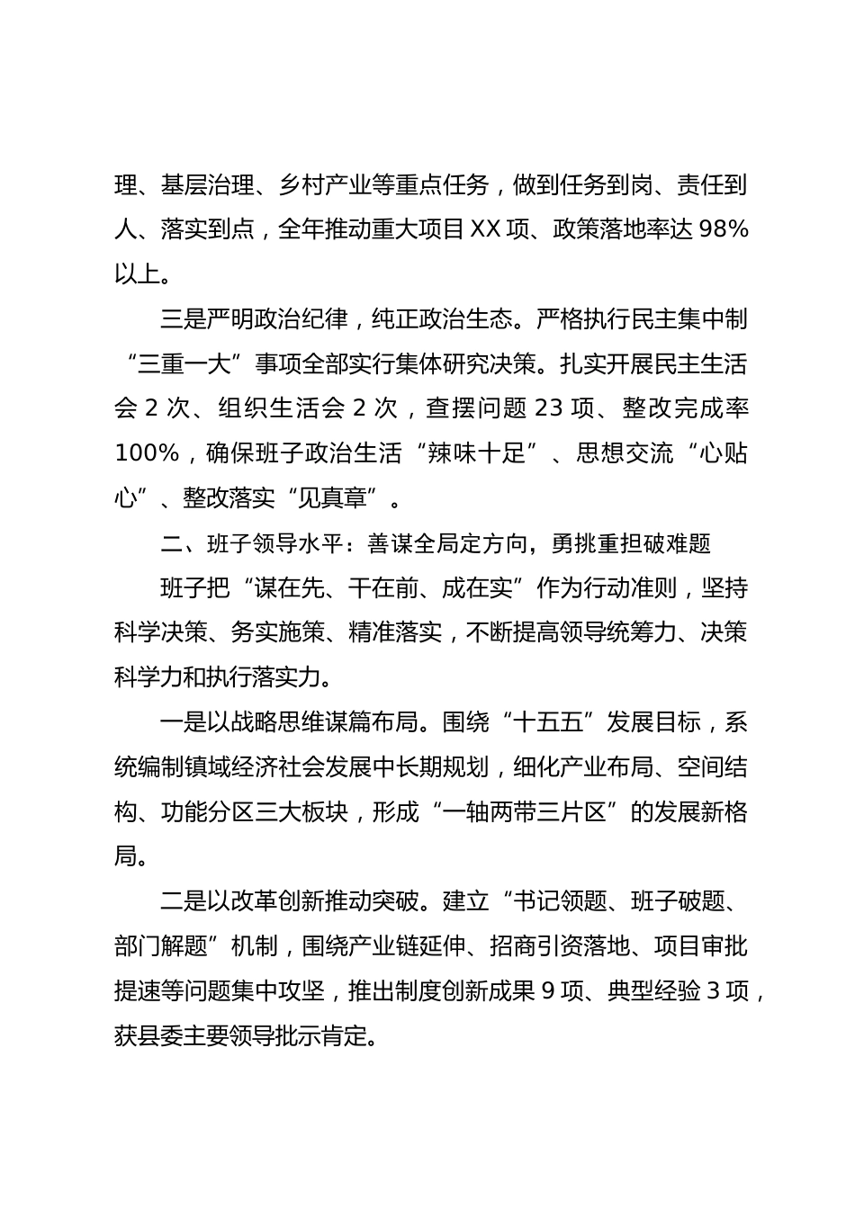 鄉(xiāng)鎮(zhèn)領(lǐng)導(dǎo)班子2025年度建設(shè)自查自評(píng)報(bào)告2025年,是“十四五”圓滿收官、“十五五”開篇布局的關(guān)鍵之年,是貫徹黨的二十屆四中全會(huì)精神、深入推進(jìn)中央八項(xiàng)規(guī)定精神學(xué)習(xí)教育和黨紀(jì)學(xué)習(xí)教育的重要一年。一年來,鄉(xiāng)鎮(zhèn)領(lǐng)導(dǎo)班子堅(jiān)持以習(xí)近平新時(shí)代中國特色社會(huì)主義思想為根本遵循,全面落實(shí)省委、市委、縣委決策部署,以政治建設(shè)為統(tǒng)領(lǐng)、以發(fā)展為導(dǎo)向、以作風(fēng)為保障,奮力推動(dòng)經(jīng)濟(jì)社會(huì)高質(zhì)量發(fā)展和鄉(xiāng)村全面振興,為“十五五”開好局、起好步奠定了堅(jiān)實(shí)基礎(chǔ)。一、班子政治表現(xiàn):旗幟鮮明講政治,立根鑄魂守初心政治是方向、旗幟和靈魂。一年來,班子始終把政治建設(shè)擺在首位,把“...