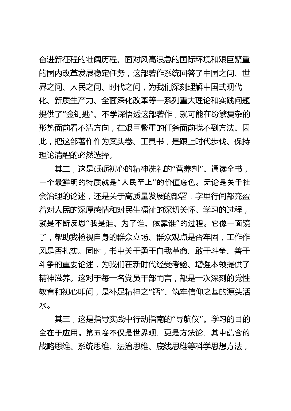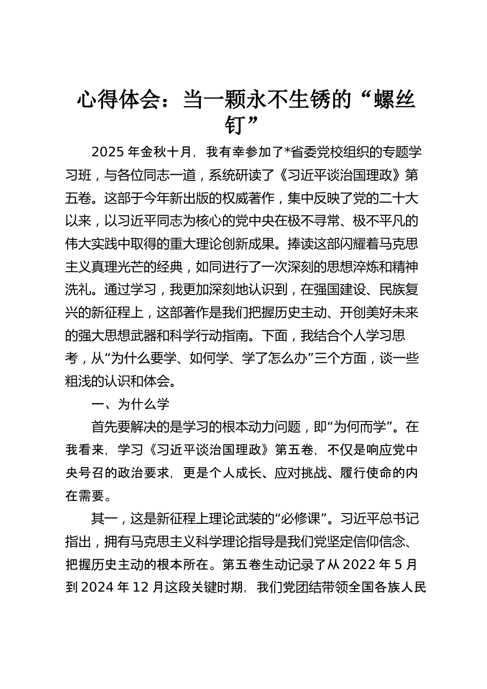 心得體會(huì):當(dāng)一顆永不生銹的“螺絲釘”2025年金秋十月,我有幸參加了*省委黨校組織的專題學(xué)習(xí)班,與各位同志一道,系統(tǒng)研讀了《習(xí)近平談治國理政》第五卷。這部于今年新出版的權(quán)威著作,集中反映了黨的二十大以來,以習(xí)近平同志為核心的黨中央在極不尋常、極不平凡的偉大實(shí)踐中取得的重大理論創(chuàng)新成果。捧讀這部閃耀著馬克思主義真理光芒的經(jīng)典,如同進(jìn)行了一次深刻的思想淬煉和精神洗禮。通過學(xué)習(xí),我更加深刻地認(rèn)識(shí)到,在強(qiáng)國建設(shè)、民族復(fù)興的新征程上,這部著作是我們把握歷史主動(dòng)、開創(chuàng)美好未來的強(qiáng)大思想武器和科學(xué)行動(dòng)指南。下面,我結(jié)合個(gè)人學(xué)習(xí)思“”考,從為什...