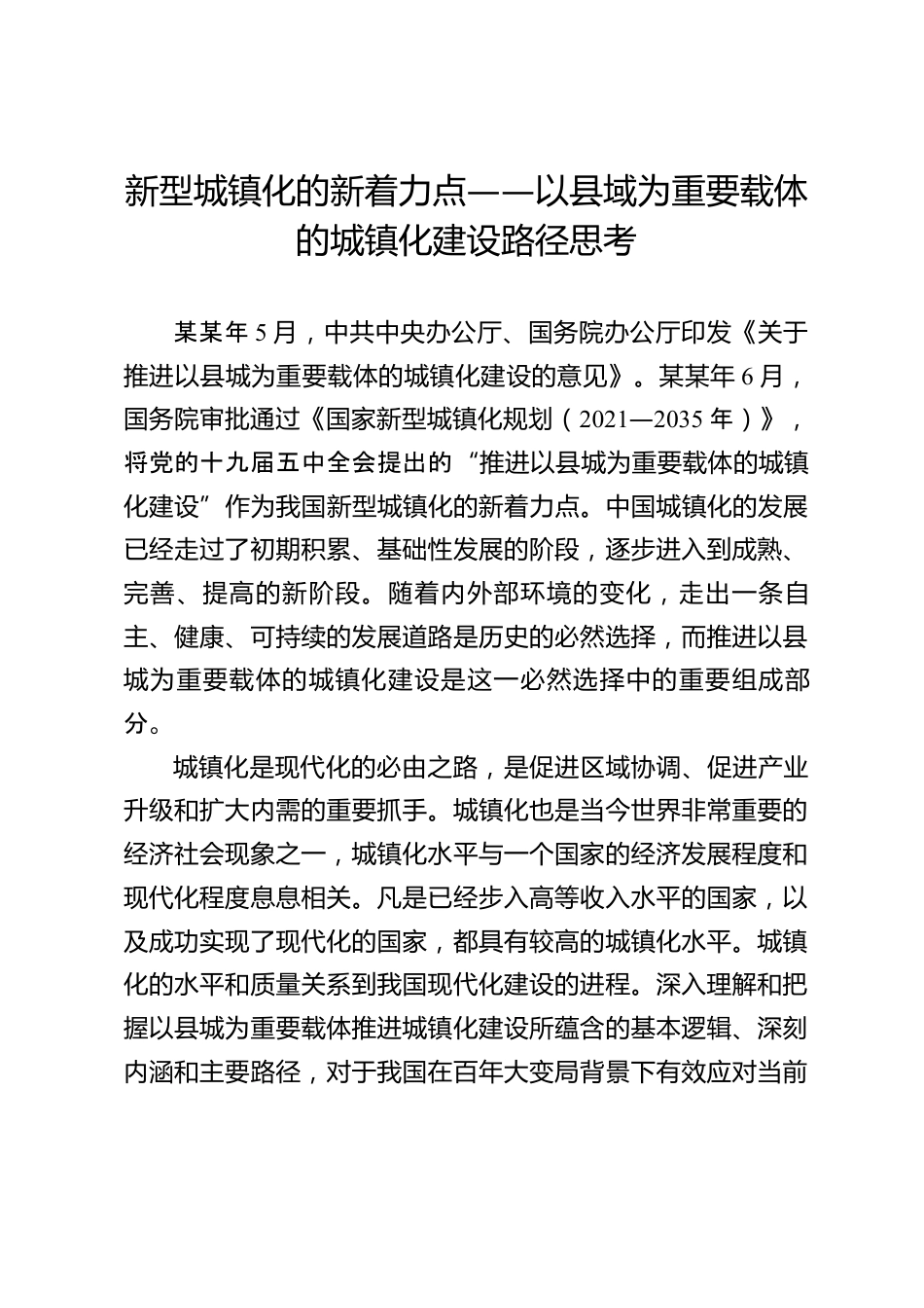 新型城鎮(zhèn)化的新著力點(diǎn)——以縣域?yàn)橹匾d體的城鎮(zhèn)化建設(shè)路徑思考某某年5月,中共中央辦公廳、國(guó)務(wù)院辦公廳印發(fā)《關(guān)于推進(jìn)以縣城為重要載體的城鎮(zhèn)化建設(shè)的意見(jiàn)》。某某年6月,國(guó)務(wù)院審批通過(guò)《國(guó)家新型城鎮(zhèn)化規(guī)劃(2021—2035年)》,將黨的十九屆五中全會(huì)提出的“推進(jìn)以縣城為重要載體的城鎮(zhèn)化建設(shè)”作為我國(guó)新型城鎮(zhèn)化的新著力點(diǎn)。中國(guó)城鎮(zhèn)化的發(fā)展已經(jīng)走過(guò)了初期積累、基礎(chǔ)性發(fā)展的階段,逐步進(jìn)入到成熟、完善、提高的新階段。隨著內(nèi)外部環(huán)境的變化,走出一條自主、健康、可持續(xù)的發(fā)展道路是歷史的必然選擇,而推進(jìn)以縣城為重要載體的城鎮(zhèn)化建設(shè)是這一必然選擇中的重要...