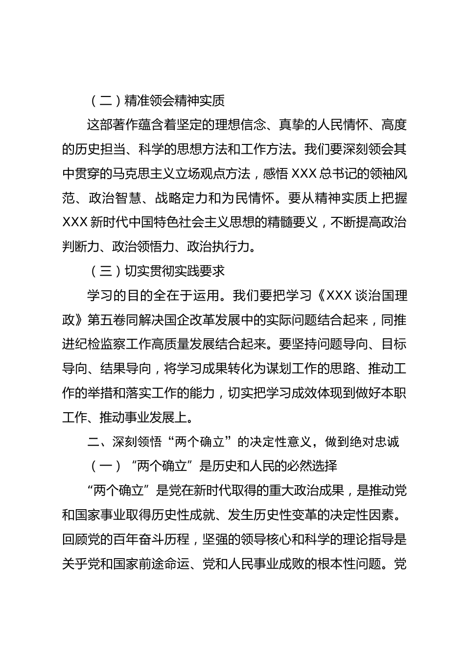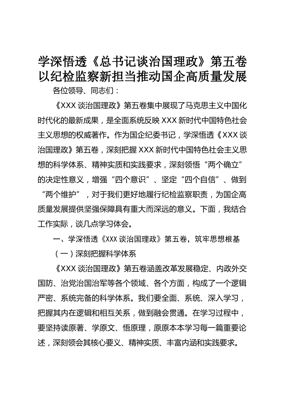 學(xué)深悟透《總書記談治國理政》第五卷以紀(jì)檢監(jiān)察新?lián)?dāng)推動國企高質(zhì)量發(fā)展各位領(lǐng)導(dǎo)、同志們:《XXX談治國理政》第五卷集中展現(xiàn)了馬克思主義中國化時代化的最新成果,是全面系統(tǒng)反映XXX新時代中國特色社會主義思想的權(quán)威著作。作為國企紀(jì)委書記,學(xué)深悟透《XXX談治國理政》第五卷,深刻把握XXX新時代中國特色社會主義思想的科學(xué)體系、精神實質(zhì)和實踐要求,深刻領(lǐng)悟“兩個確立”的決定性意義,增強“四個意識”、堅定“四個自信”、做到“兩個維護”,對于我們更好地履行紀(jì)檢監(jiān)察職責(zé),為國企高質(zhì)量發(fā)展提供堅強保障具有重大而深遠的意義。下面,我結(jié)合工作實際,談幾點學(xué)習(xí)...
