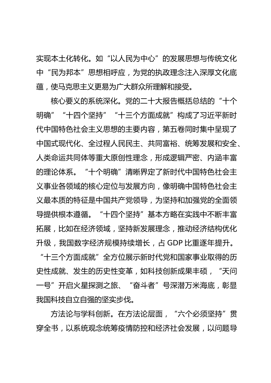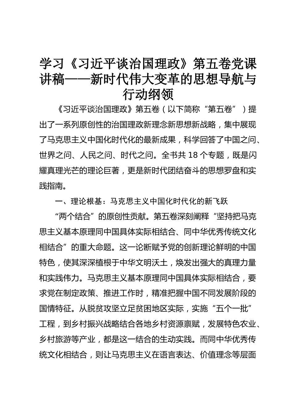 學習《習近平談治國理政》第五卷黨課講稿——新時代偉大變革的思想導航與行動綱領《習近平談治國理政》第五卷(以下簡稱“第五卷”)提出了一系列原創(chuàng)性的治國理政新理念新思想新戰(zhàn)略,集中展現(xiàn)了馬克思主義中國化時代化的最新成果,科學回答了中國之問、世界之問、人民之問、時代之問。全書共18個專題,既是閃耀真理光芒的理論巨著,更是新時代團結奮斗的思想羅盤和實踐指南。一、理論根基:馬克思主義中國化時代化的新飛躍“兩個結合”的原創(chuàng)性貢獻。第五卷深刻闡釋“堅持把馬克思主義基本原理同中國具體實際相結合、同中華優(yōu)秀傳統(tǒng)文化相結合”的重大命題。這一論斷賦...