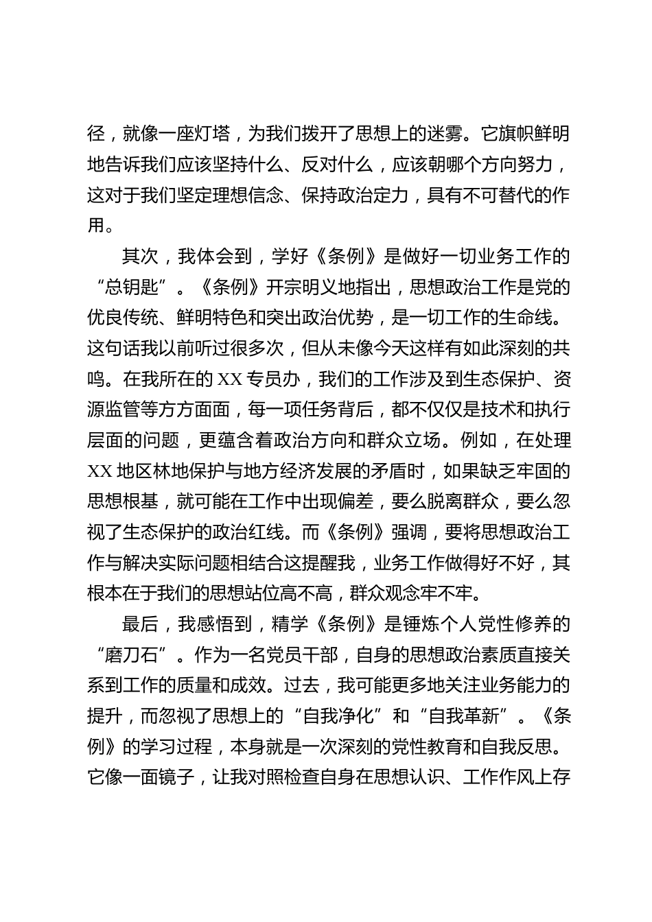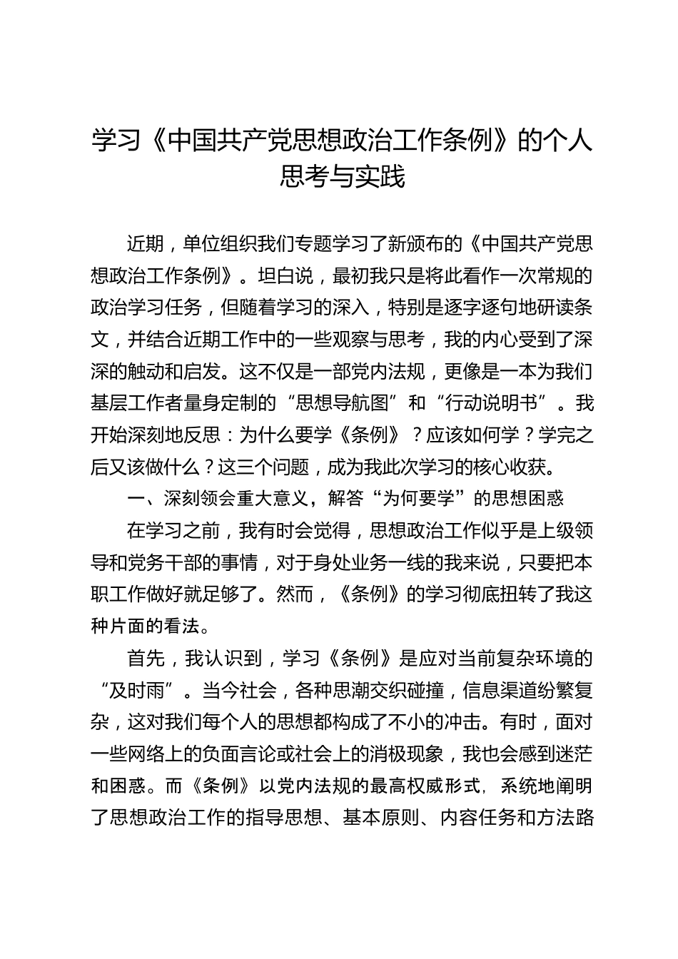 學(xué)習(xí)《中國共產(chǎn)黨思想政治工作條例》的個人思考與實踐近期,單位組織我們專題學(xué)習(xí)了新頒布的《中國共產(chǎn)黨思想政治工作條例》。坦白說,最初我只是將此看作一次常規(guī)的政治學(xué)習(xí)任務(wù),但隨著學(xué)習(xí)的深入,特別是逐字逐句地研讀條文,并結(jié)合近期工作中的一些觀察與思考,我的內(nèi)心受到了深深的觸動和啟發(fā)。這不僅是一部黨內(nèi)法規(guī),更像是一本為我們基層工作者量身定制的“思想導(dǎo)航圖”和“行動說明書”。我開始深刻地反思:為什么要學(xué)《條例》?應(yīng)該如何學(xué)?學(xué)完之后又該做什么?這三個問題,成為我此次學(xué)習(xí)的核心收獲。一、深刻領(lǐng)會重大意義,解答“為何要學(xué)”的思想困惑在學(xué)習(xí)...