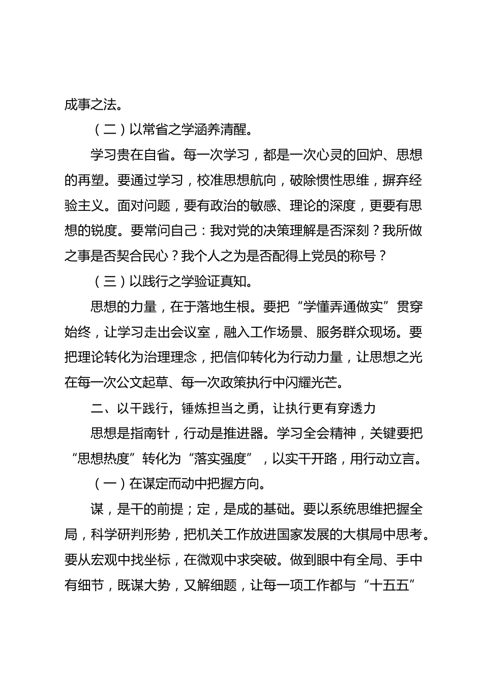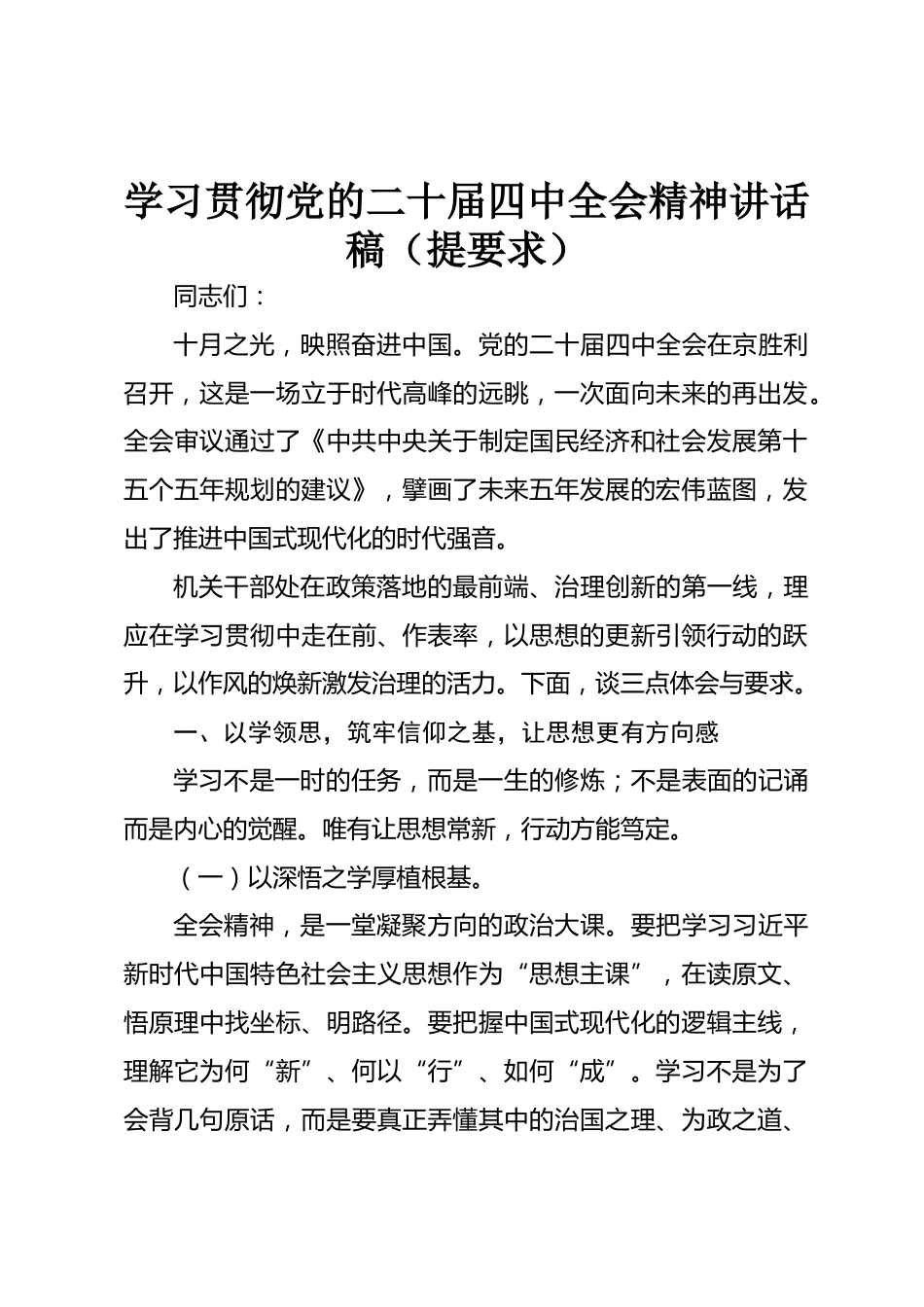 學(xué)習(xí)貫徹黨的二十屆四中全會(huì)精神講話稿(提要求)同志們:十月之光,映照奮進(jìn)中國(guó)。黨的二十屆四中全會(huì)在京勝利召開,這是一場(chǎng)立于時(shí)代高峰的遠(yuǎn)眺,一次面向未來(lái)的再出發(fā)。全會(huì)審議通過了《中共中央關(guān)于制定國(guó)民經(jīng)濟(jì)和社會(huì)發(fā)展第十五個(gè)五年規(guī)劃的建議》,擘畫了未來(lái)五年發(fā)展的宏偉藍(lán)圖,發(fā)出了推進(jìn)中國(guó)式現(xiàn)代化的時(shí)代強(qiáng)音。機(jī)關(guān)干部處在政策落地的最前端、治理創(chuàng)新的第一線,理應(yīng)在學(xué)習(xí)貫徹中走在前、作表率,以思想的更新引領(lǐng)行動(dòng)的躍升,以作風(fēng)的煥新激發(fā)治理的活力。下面,談三點(diǎn)體會(huì)與要求。一、以學(xué)領(lǐng)思,筑牢信仰之基,讓思想更有方向感學(xué)習(xí)不是一時(shí)的任務(wù),而是一...