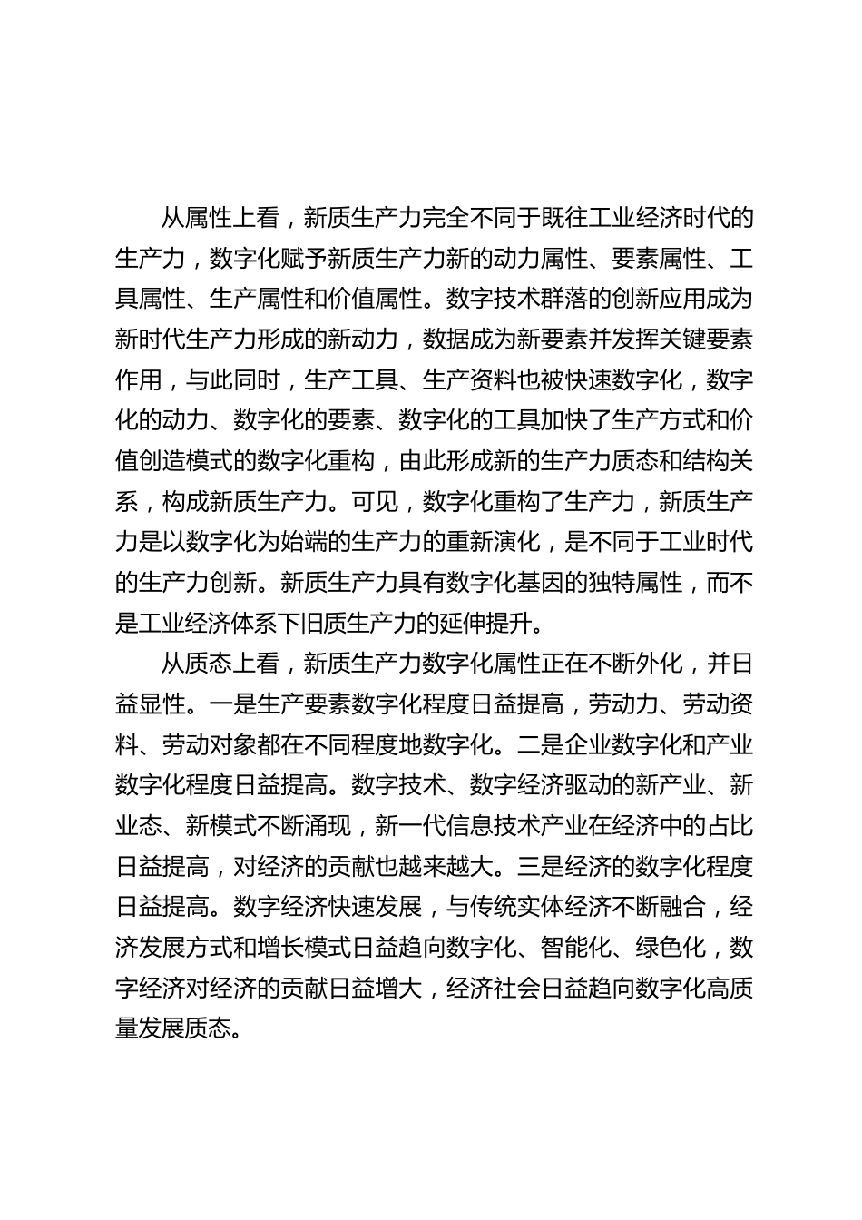 要深化對(duì)新質(zhì)生產(chǎn)力本質(zhì)的認(rèn)識(shí)數(shù)字經(jīng)濟(jì)是伴隨著數(shù)智文明興起的新經(jīng)濟(jì)形態(tài),是新時(shí)代高質(zhì)量發(fā)展的重要引擎,正在成為重組全球要素資源、重塑全球經(jīng)濟(jì)結(jié)構(gòu)、改變?nèi)蚋?jìng)爭(zhēng)格局的關(guān)鍵力量,也正在重塑生產(chǎn)力的要素結(jié)構(gòu)、動(dòng)力機(jī)制及發(fā)展模式,是先進(jìn)生產(chǎn)力的集中代表,構(gòu)成新質(zhì)生產(chǎn)力發(fā)展的典型范式。深入研究數(shù)字經(jīng)濟(jì)賦予新質(zhì)生產(chǎn)力的內(nèi)涵特質(zhì)和邏輯范式,是豐富和完善新質(zhì)生產(chǎn)力理論創(chuàng)新的重要內(nèi)容,對(duì)于把握時(shí)代變局、搶占發(fā)展先機(jī)具有深遠(yuǎn)的戰(zhàn)略意義。數(shù)字化成為新質(zhì)生產(chǎn)力發(fā)展的一般屬性和質(zhì)態(tài)特征認(rèn)知新質(zhì)生產(chǎn)力,歸根結(jié)底是要揭示新質(zhì)生產(chǎn)力的特質(zhì)。新質(zhì)生產(chǎn)力是新時(shí)代...