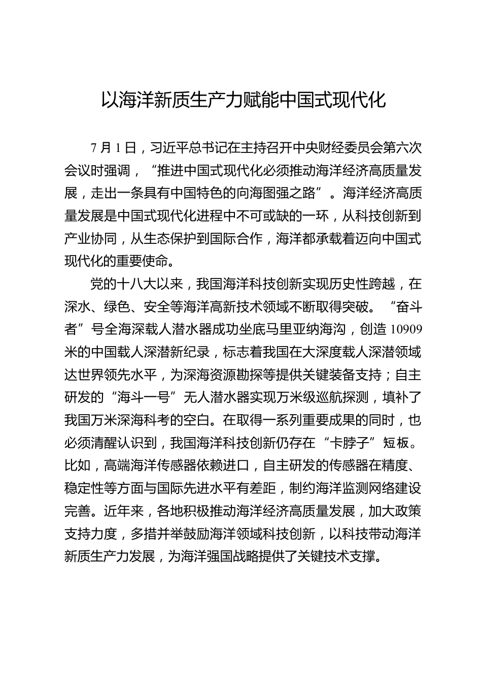 以海洋新質生產力賦能中國式現(xiàn)代化7月1日,習近平總書記在主持召開中央財經委員會第六次會議時強調,“推進中國式現(xiàn)代化必須推動海洋經濟高質量發(fā)展,走出一條具有中國特色的向海圖強之路”。海洋經濟高質量發(fā)展是中國式現(xiàn)代化進程中不可或缺的一環(huán),從科技創(chuàng)新到產業(yè)協(xié)同,從生態(tài)保護到國際合作,海洋都承載著邁向中國式現(xiàn)代化的重要使命。黨的十八大以來,我國海洋科技創(chuàng)新實現(xiàn)歷史性跨越,在深水、綠色、安全等海洋高新技術領域不斷取得突破?!皧^斗者”號全海深載人潛水器成功坐底馬里亞納海溝,創(chuàng)造10909米的中國載人深潛新紀錄,標志著我國在大深度載人深潛領域達...