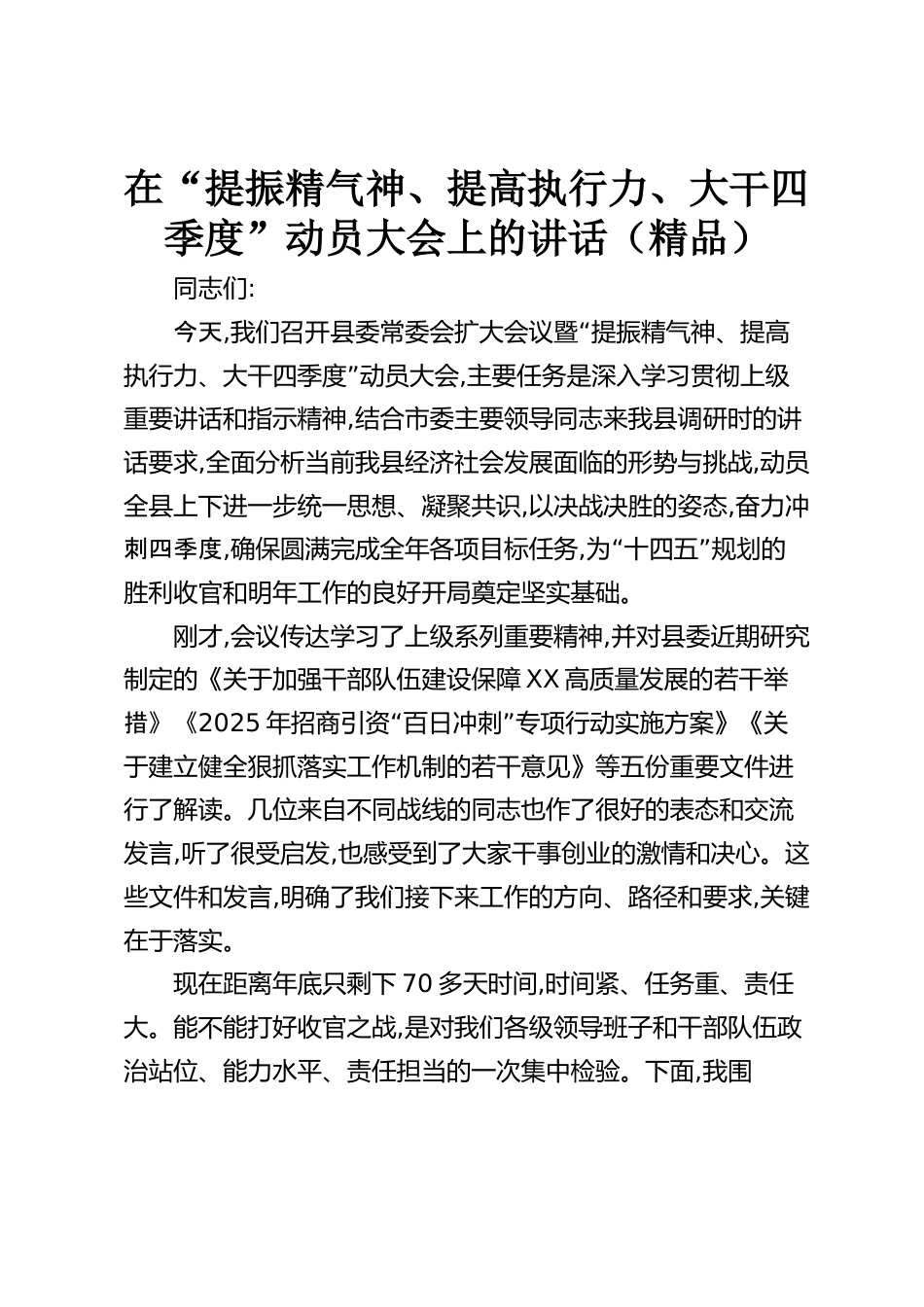 在“提振精氣神、提高執(zhí)行力、大干四季度”動(dòng)員大會(huì)上的講話(精品)同志們:今天,“我們召開縣委常委會(huì)擴(kuò)大會(huì)議暨提振精氣神、提高”執(zhí)行力、大干四季度動(dòng)員大會(huì),主要任務(wù)是深入學(xué)習(xí)貫徹上級(jí)重要講話和指示精神,結(jié)合市委主要領(lǐng)導(dǎo)同志來我縣調(diào)研時(shí)的講話要求,全面分析當(dāng)前我縣經(jīng)濟(jì)社會(huì)發(fā)展面臨的形勢(shì)與挑戰(zhàn),動(dòng)員全縣上下進(jìn)一步統(tǒng)一思想、凝聚共識(shí),以決戰(zhàn)決勝的姿態(tài),奮力沖刺四季度,確保圓滿完成全年各項(xiàng)目標(biāo)任務(wù),“”為十四五規(guī)劃的勝利收官和明年工作的良好開局奠定堅(jiān)實(shí)基礎(chǔ)。剛才,會(huì)議傳達(dá)學(xué)習(xí)了上級(jí)系列重要精神,并對(duì)縣委近期研究制定的《關(guān)于加強(qiáng)干部隊(duì)伍建設(shè)保障XX高...