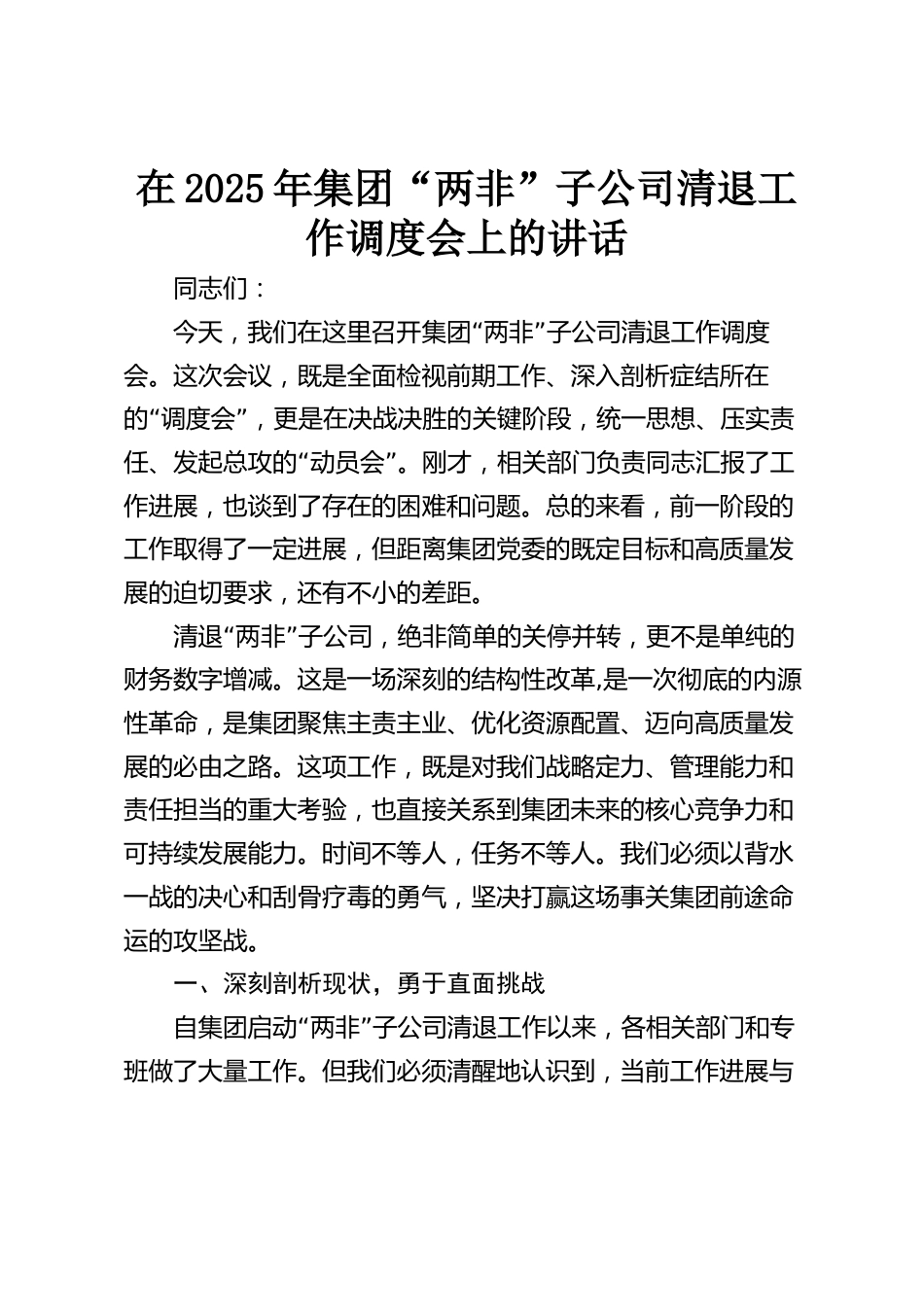 在2025年集團“兩非”子公司清退工作調(diào)度會上的講話