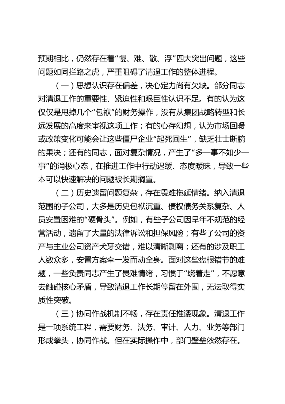 在2025年集團“兩非”子公司清退工作調(diào)度會上的講話同志們:“”今天,我們在這里召開集團兩非子公司清退工作調(diào)度會。這次會議,既是全面檢視前期工作、深入剖析癥結(jié)所在“”的調(diào)度會,更是在決戰(zhàn)決勝的關(guān)鍵階段,統(tǒng)一思想、壓實責“”任、發(fā)起總攻的動員會。剛才,相關(guān)部門負責同志匯報了工作進展,也談到了存在的困難和問題。總的來看,前一階段的工作取得了一定進展,但距離集團黨委的既定目標和高質(zhì)量發(fā)展的迫切要求,還有不小的差距?!啊鼻逋藘煞亲庸?,絕非簡單的關(guān)停并轉(zhuǎn),更不是單純的財務數(shù)字增減。這是一場深刻的結(jié)構(gòu)性改革,是一次徹底的內(nèi)源性革命,是集團...