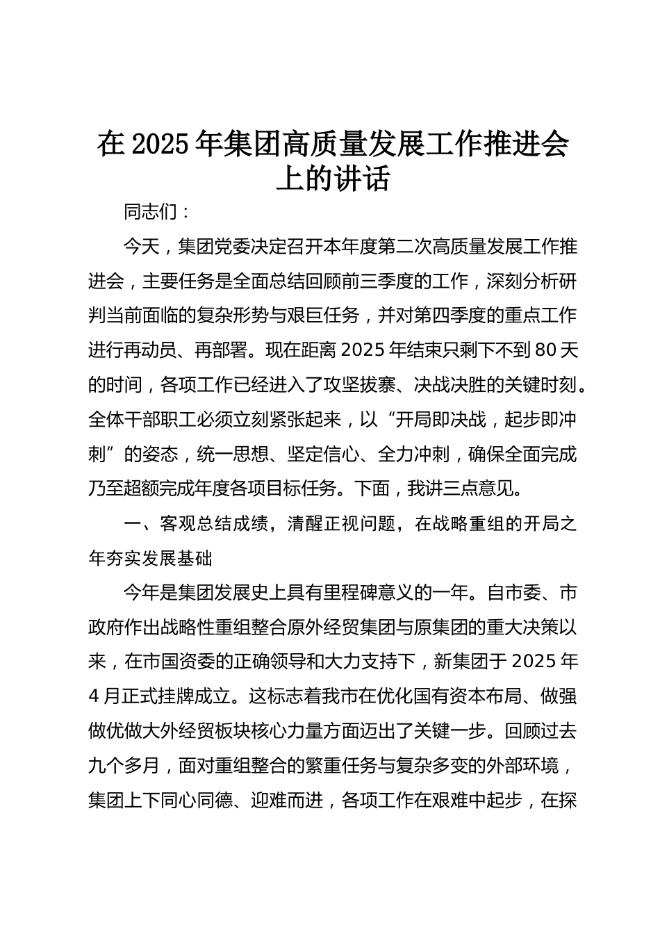 在2025年集團(tuán)高質(zhì)量發(fā)展工作推進(jìn)會(huì)上的講話