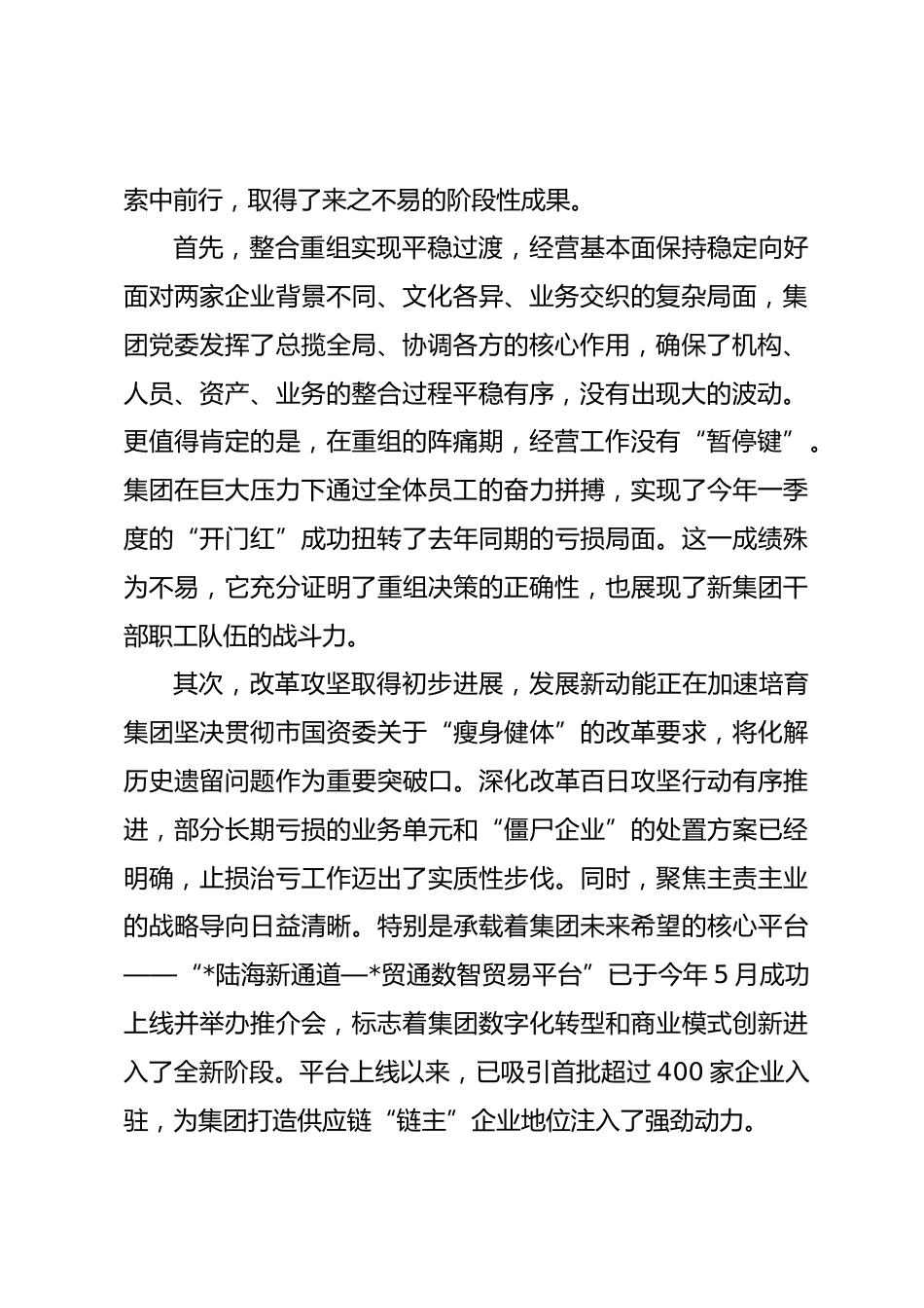 在2025年集團(tuán)高質(zhì)量發(fā)展工作推進(jìn)會(huì)上的講話同志們:今天,集團(tuán)黨委決定召開本年度第二次高質(zhì)量發(fā)展工作推進(jìn)會(huì),主要任務(wù)是全面總結(jié)回顧前三季度的工作,深刻分析研判當(dāng)前面臨的復(fù)雜形勢(shì)與艱巨任務(wù),并對(duì)第四季度的重點(diǎn)工作進(jìn)行再動(dòng)員、再部署。現(xiàn)在距離2025年結(jié)束只剩下不到80天的時(shí)間,各項(xiàng)工作已經(jīng)進(jìn)入了攻堅(jiān)拔寨、決戰(zhàn)決勝的關(guān)鍵時(shí)刻。全體干部職工必須立刻緊張起來(lái),以“開局即決戰(zhàn),起步即沖刺”的姿態(tài),統(tǒng)一思想、堅(jiān)定信心、全力沖刺,確保全面完成乃至超額完成年度各項(xiàng)目標(biāo)任務(wù)。下面,我講三點(diǎn)意見。一、客觀總結(jié)成績(jī),清醒正視問(wèn)題,在戰(zhàn)略重組的開局之年夯實(shí)發(fā)...