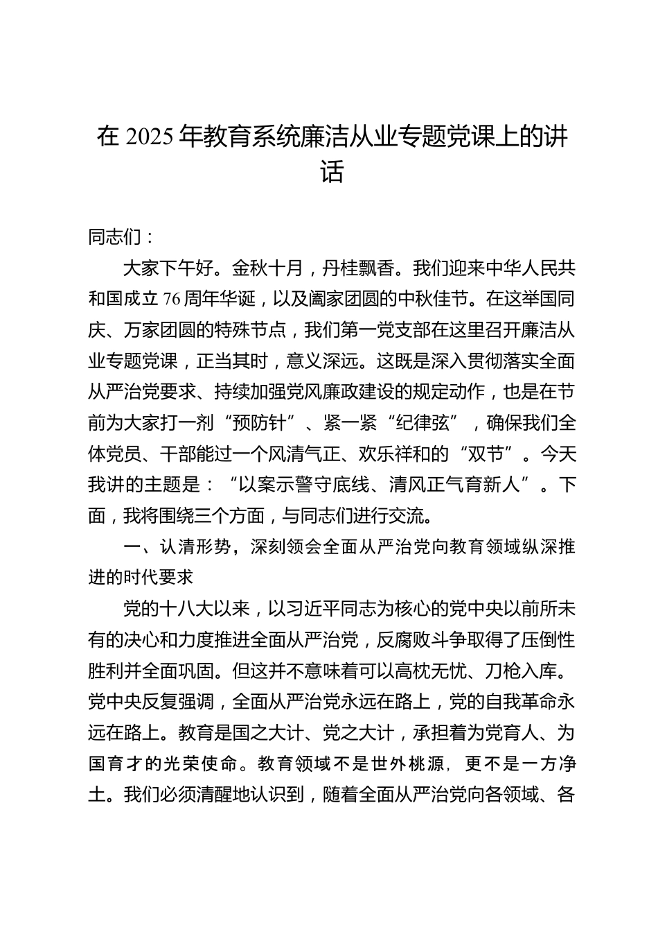 在2025年教育系統(tǒng)廉潔從業(yè)專題黨課上的講話