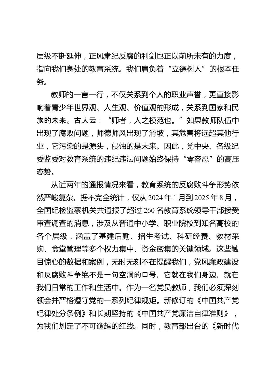 在2025年教育系統(tǒng)廉潔從業(yè)專題黨課上的講話同志們:大家下午好。金秋十月,丹桂飄香。我們迎來中華人民共和國成立76周年華誕,以及闔家團圓的中秋佳節(jié)。在這舉國同慶、萬家團圓的特殊節(jié)點,我們第一黨支部在這里召開廉潔從業(yè)專題黨課,正當其時,意義深遠。這既是深入貫徹落實全面從嚴治黨要求、持續(xù)加強黨風廉政建設(shè)的規(guī)定動作,也是在節(jié)前為大家打一劑“預(yù)防針”、緊一緊“紀律弦”,確保我們?nèi)w黨員、干部能過一個風清氣正、歡樂祥和的“雙節(jié)”。今天我講的主題是:“以案示警守底線、清風正氣育新人”。下面,我將圍繞三個方面,與同志們進行交流。一、認清形勢,深...
