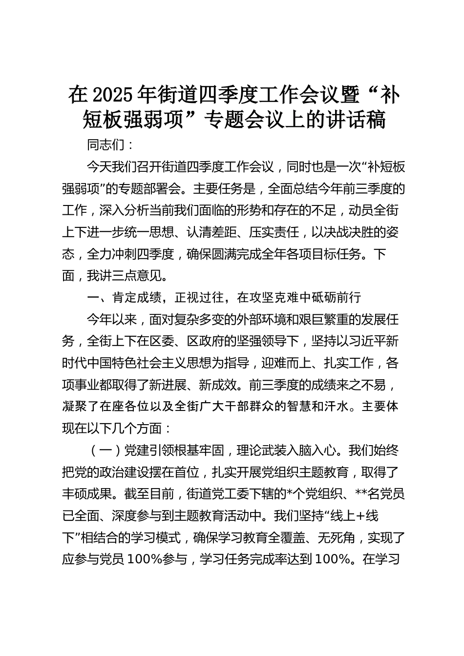 在2025年街道四季度工作會(huì)議暨“補(bǔ)短板強(qiáng)弱項(xiàng)”專題會(huì)議上的講話稿