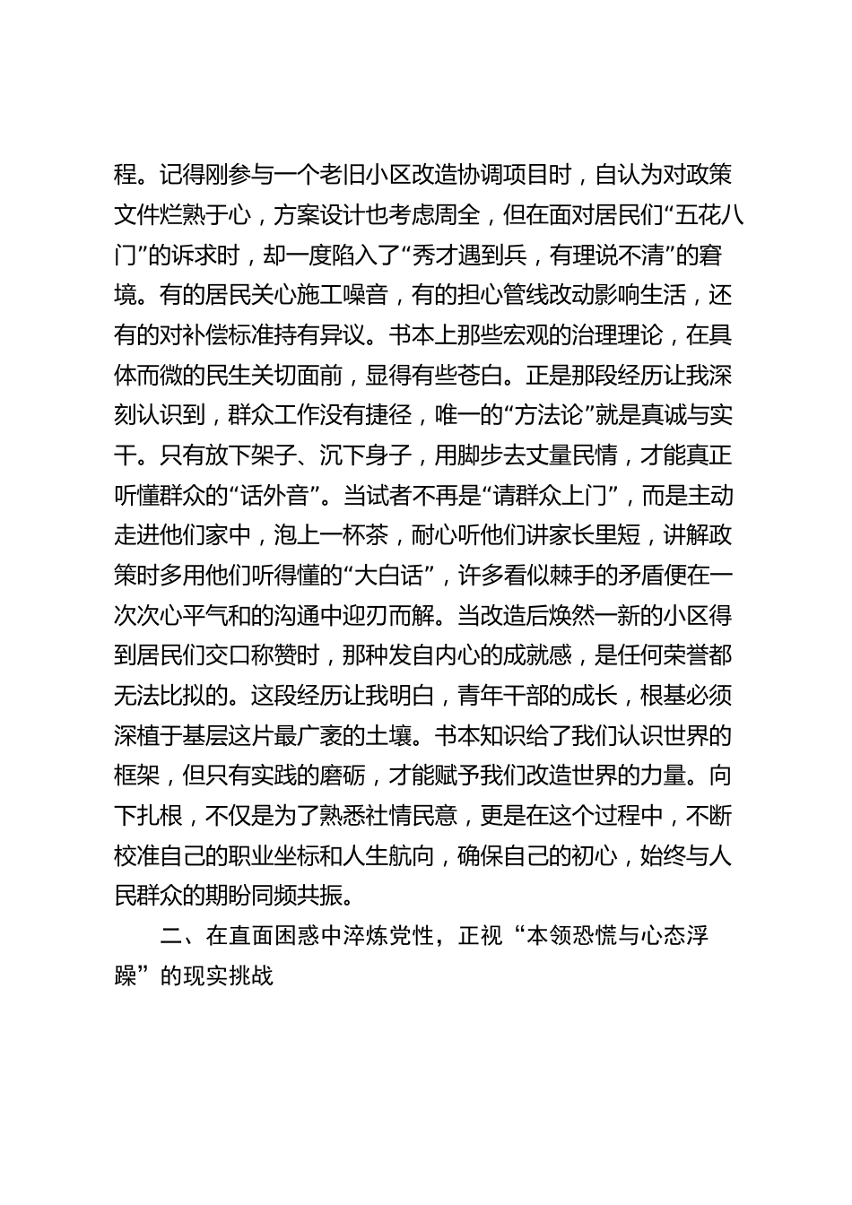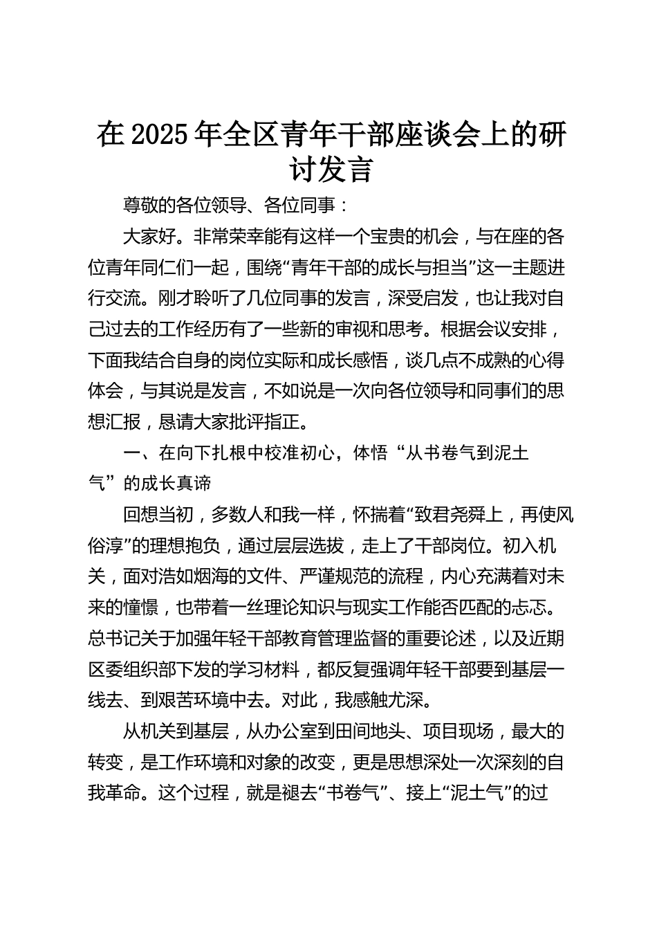 在2025年全區(qū)青年干部座談會(huì)上的研討發(fā)言尊敬的各位領(lǐng)導(dǎo)、各位同事:大家好。非常榮幸能有這樣一個(gè)寶貴的機(jī)會(huì),與在座的各“”位青年同仁們一起,圍繞青年干部的成長(zhǎng)與擔(dān)當(dāng)這一主題進(jìn)行交流。剛才聆聽了幾位同事的發(fā)言,深受啟發(fā),也讓我對(duì)自己過去的工作經(jīng)歷有了一些新的審視和思考。根據(jù)會(huì)議安排,下面我結(jié)合自身的崗位實(shí)際和成長(zhǎng)感悟,談幾點(diǎn)不成熟的心得體會(huì),與其說是發(fā)言,不如說是一次向各位領(lǐng)導(dǎo)和同事們的思想?yún)R報(bào),懇請(qǐng)大家批評(píng)指正。一、在向下扎根中校準(zhǔn)初心,體悟“從書卷氣到泥土氣”的成長(zhǎng)真諦“回想當(dāng)初,多數(shù)人和我一樣,懷揣著致君堯舜上,再使風(fēng)”俗淳...