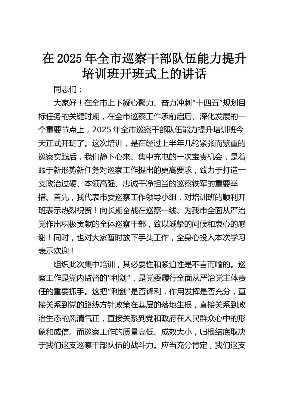 在2025年全市巡察干部隊伍能力提升培訓班開班式上的講話