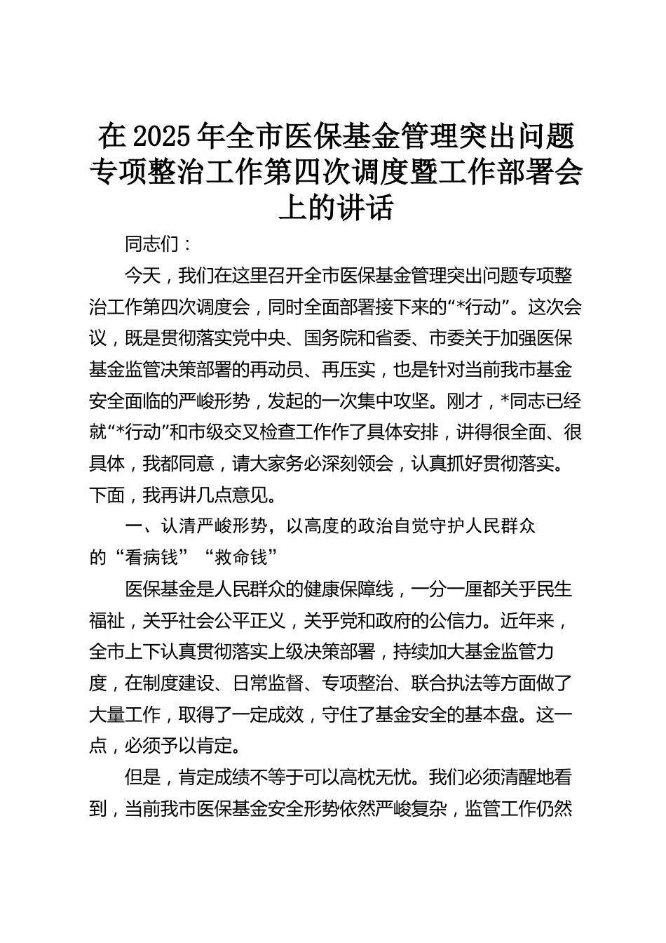 在2025年全市醫(yī)?;鸸芾硗怀鰡栴}專項整治工作第四次調度暨工作部署會上的講話
