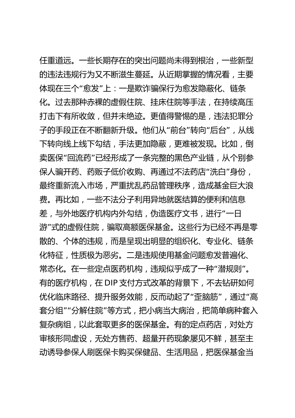 在2025年全市醫(yī)保基金管理突出問題專項整治工作第四次調度暨工作部署會上的講話同志們:今天,我們在這里召開全市醫(yī)?;鸸芾硗怀鰡栴}專項整“治工作第四次調度會,同時全面部署接下來的*”行動。這次會議,既是貫徹落實黨中央、國務院和省委、市委關于加強醫(yī)保基金監(jiān)管決策部署的再動員、再壓實,也是針對當前我市基金安全面臨的嚴峻形勢,發(fā)起的一次集中攻堅。剛才,*同志已經“就*”行動和市級交叉檢查工作作了具體安排,講得很全面、很具體,我都同意,請大家務必深刻領會,認真抓好貫徹落實。下面,我再講幾點意見。一、認清嚴峻形勢,以高度的政治自覺守護人民群...