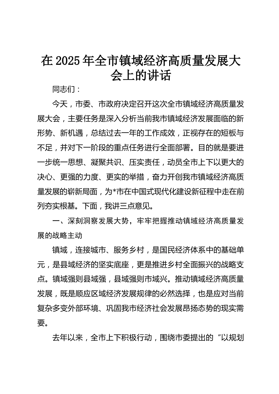在2025年全市鎮(zhèn)域經(jīng)濟高質(zhì)量發(fā)展大會上的講話