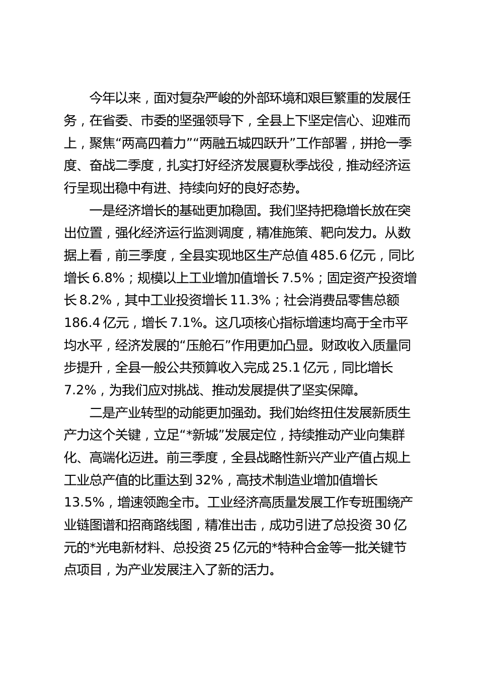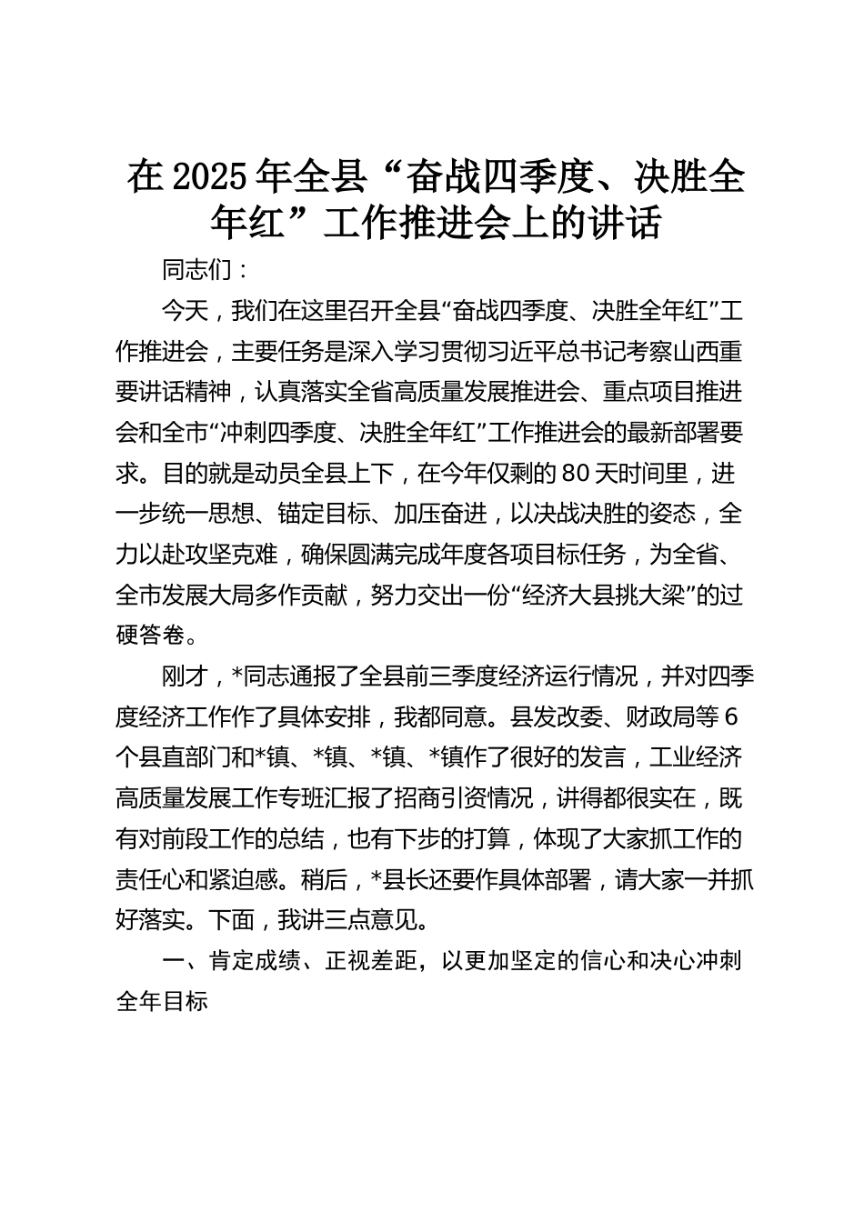 在2025年全縣“奮戰(zhàn)四季度、決勝全年紅”工作推進(jìn)會(huì)上的講話同志們:“”今天,我們?cè)谶@里召開(kāi)全縣奮戰(zhàn)四季度、決勝全年紅工作推進(jìn)會(huì),主要任務(wù)是深入學(xué)習(xí)貫徹習(xí)近平總書記考察山西重要講話精神,認(rèn)真落實(shí)全省高質(zhì)量發(fā)展推進(jìn)會(huì)、重點(diǎn)項(xiàng)目推進(jìn)“”會(huì)和全市沖刺四季度、決勝全年紅工作推進(jìn)會(huì)的最新部署要求。目的就是動(dòng)員全縣上下,在今年僅剩的80天時(shí)間里,進(jìn)一步統(tǒng)一思想、錨定目標(biāo)、加壓奮進(jìn),以決戰(zhàn)決勝的姿態(tài),全力以赴攻堅(jiān)克難,確保圓滿完成年度各項(xiàng)目標(biāo)任務(wù),為全省、“”全市發(fā)展大局多作貢獻(xiàn),努力交出一份經(jīng)濟(jì)大縣挑大梁的過(guò)硬答卷。剛才,*同志通報(bào)了全縣前三...