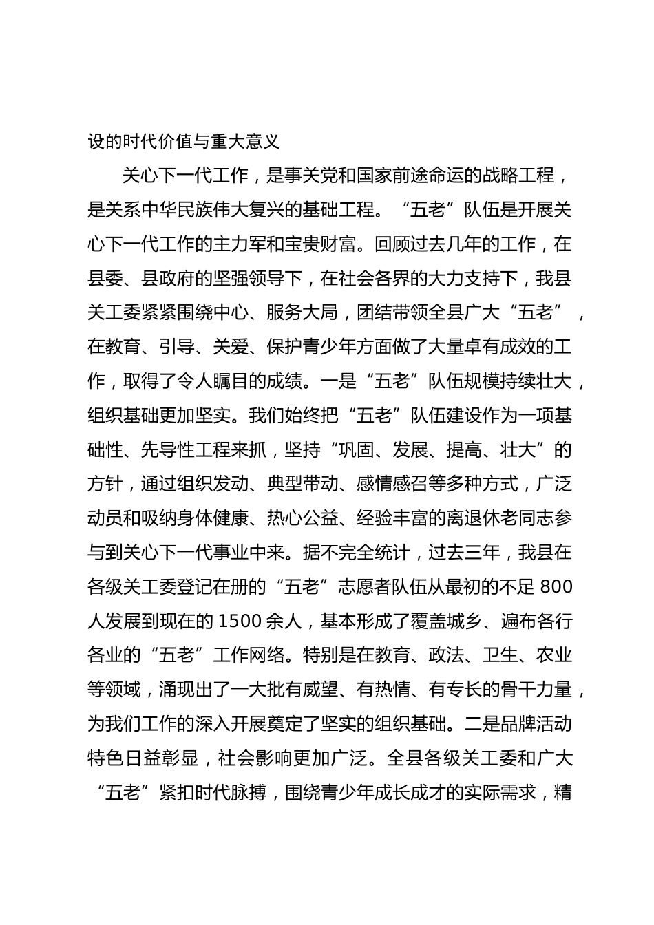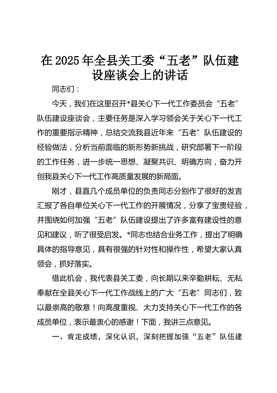 在2025年全縣關(guān)工委“五老”隊(duì)伍建設(shè)座談會(huì)上的講話同志們:今天,我們?cè)谶@里召開*縣關(guān)心下一代工作委員會(huì)“五老”隊(duì)伍建設(shè)座談會(huì),主要任務(wù)是深入學(xué)習(xí)領(lǐng)會(huì)關(guān)于關(guān)心下一代工作的重要指示精神,總結(jié)交流我縣近年來“五老”隊(duì)伍建設(shè)的經(jīng)驗(yàn)做法,分析當(dāng)前面臨的新形勢(shì)新挑戰(zhàn),研究部署下一階段的工作任務(wù),進(jìn)一步統(tǒng)一思想、凝聚共識(shí)、明確方向,奮力開創(chuàng)我縣關(guān)心下一代工作高質(zhì)量發(fā)展的新局面。剛才,縣直幾個(gè)成員單位的負(fù)責(zé)同志分別作了很好的發(fā)言匯報(bào)了各自單位關(guān)心下一代工作的開展情況,分享了寶貴經(jīng)驗(yàn),并圍繞如何加強(qiáng)“五老”隊(duì)伍建設(shè)提出了許多富有建設(shè)性的意見和建...