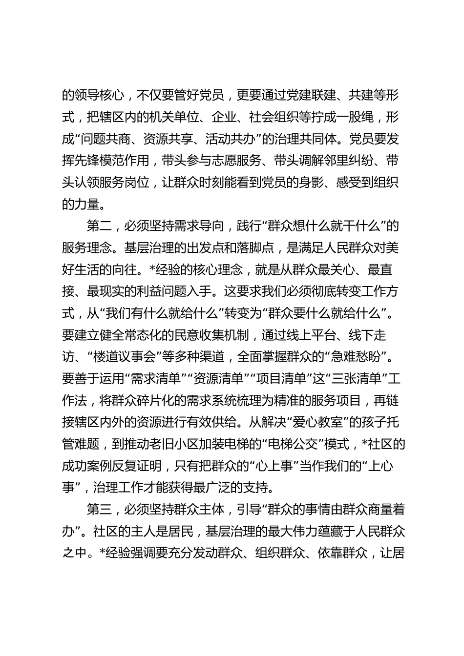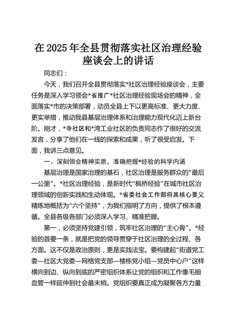 在2025年全縣貫徹落實社區(qū)治理經(jīng)驗座談會上的講話同志們:今天,我們召開全縣貫徹落實*社區(qū)治理經(jīng)驗座談會,主要任務是深入學習領會*省推廣*社區(qū)治理經(jīng)驗現(xiàn)場會的精神,全面落實*市的決策部署,動員全縣上下以更高標準、更大力度、更實舉措,推動我縣基層治理體系和治理能力現(xiàn)代化邁上新臺階。剛才,*寺社區(qū)和*灣工業(yè)社區(qū)的負責同志作了很好的交流發(fā)言,分享了他們在一線的探索和成果,聽了很受啟發(fā)。下面,我講三點意見。一、深刻領會精神實質(zhì),準確把握*經(jīng)驗的科學內(nèi)涵“基層治理是國家治理的基石,社區(qū)治理是服務群眾的最后”一公里。*“”社區(qū)治理經(jīng)驗,是新時代楓橋...