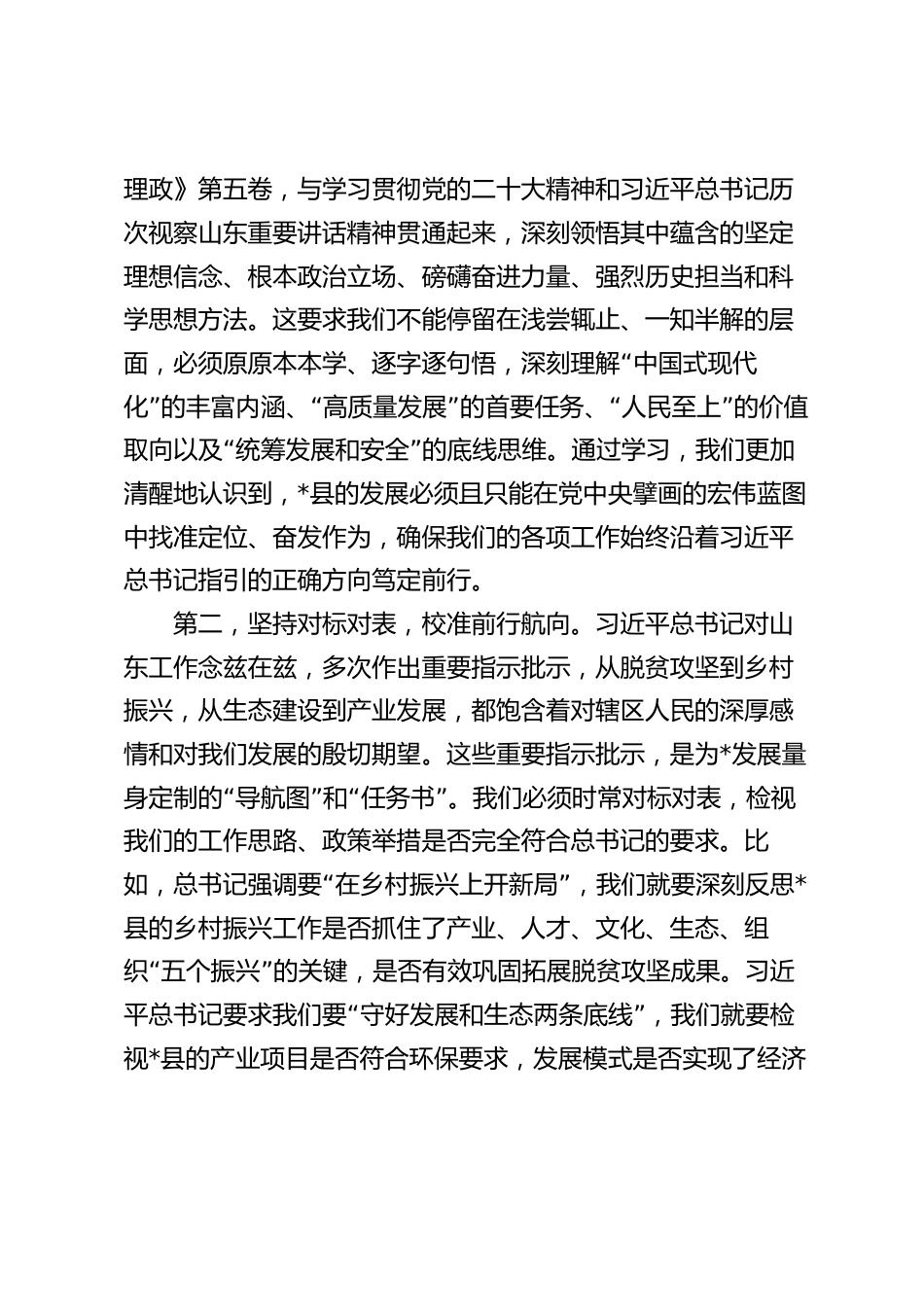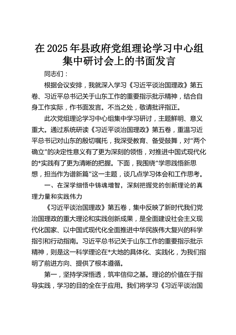 在2025年縣政府黨組理論學(xué)習(xí)中心組集中研討會上的書面發(fā)言同志們:根據(jù)會議安排,我就深入學(xué)習(xí)《習(xí)近平談治國理政》第五卷、習(xí)近平總書記關(guān)于山東工作的重要指示批示精神,結(jié)合自身工作實(shí)際,作書面發(fā)言。不當(dāng)之處,敬請批評指正。此次黨組理論學(xué)習(xí)中心組集中學(xué)習(xí)研討,主題鮮明、意義重大。通過系統(tǒng)研讀《習(xí)近平談治國理政》第五卷,重溫習(xí)近“平總書記對山東的殷切囑托,我深受教育、備受鼓舞,對兩個(gè)”確立的決定性意義有了更為深刻的領(lǐng)悟,對推進(jìn)中國式現(xiàn)代化的*“實(shí)踐有了更為清晰的把握。下面,我圍繞學(xué)思踐悟新思”想,擔(dān)當(dāng)作為譜新篇這一主題,談幾點(diǎn)學(xué)習(xí)體會和...