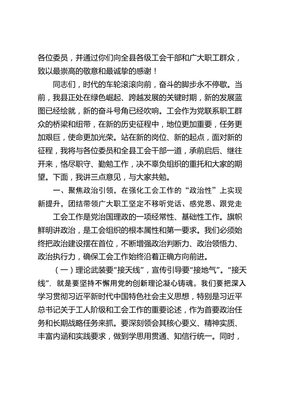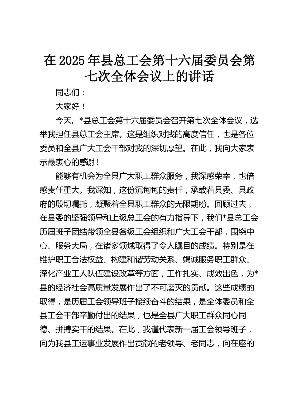 在2025年縣總工會第十六屆委員會第七次全體會議上的講話同志們:大家好!今天,*縣總工會第十六屆委員會召開第七次全體會議,選舉我擔任縣總工會主席。這是組織對我的高度信任,也是各位委員和全縣廣大工會干部對我的深切厚望。在此,我向大家表示最衷心的感謝!能夠有機會為全縣廣大職工群眾服務(wù),我深感榮幸,也倍感責任重大。我深知,這份沉甸甸的責任,承載著縣委、縣政府的殷切囑托,凝聚著全縣職工群眾的無限期盼?;仡欉^去,在縣委的堅強領(lǐng)導和上級總工會的有力指導下,我們*縣總工會歷屆班子團結(jié)帶領(lǐng)全縣各級工會組織和廣大工會干部,圍繞中心、服務(wù)大局,在諸多...