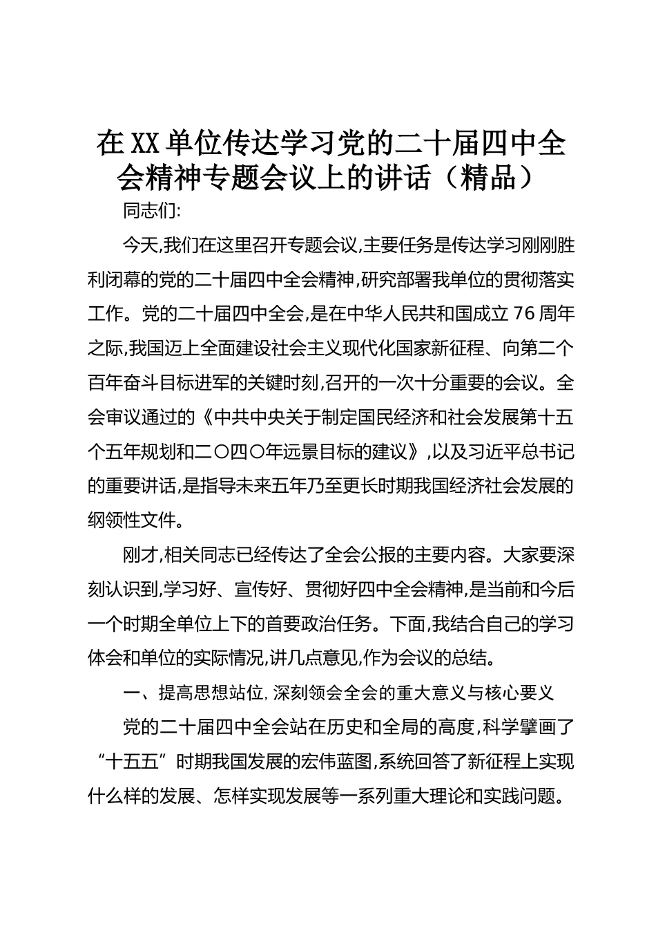 在XX單位傳達(dá)學(xué)習(xí)黨的二十屆四中全會精神專題會議上的講話(精品)