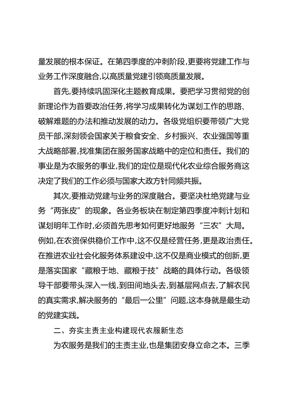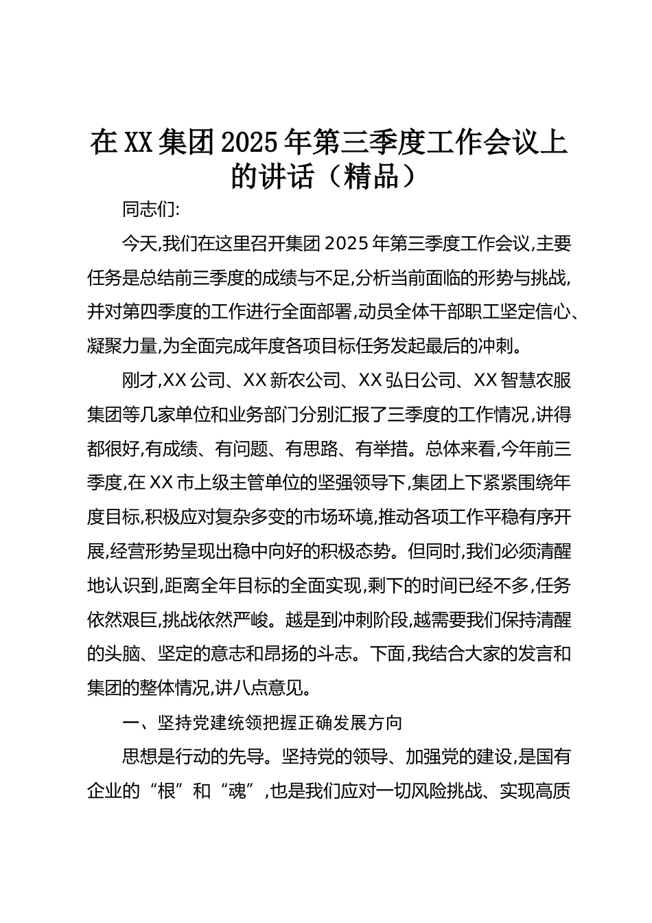 在XX集團2025年第三季度工作會議上的講話(精品)同志們:今天,我們在這里召開集團2025年第三季度工作會議,主要任務(wù)是總結(jié)前三季度的成績與不足,分析當(dāng)前面臨的形勢與挑戰(zhàn),并對第四季度的工作進行全面部署,動員全體干部職工堅定信心、凝聚力量,為全面完成年度各項目標(biāo)任務(wù)發(fā)起最后的沖刺。剛才,XX公司、XX新農(nóng)公司、XX弘日公司、XX智慧農(nóng)服集團等幾家單位和業(yè)務(wù)部門分別匯報了三季度的工作情況,講得都很好,有成績、有問題、有思路、有舉措??傮w來看,今年前三季度,在XX市上級主管單位的堅強領(lǐng)導(dǎo)下,集團上下緊緊圍繞年度目標(biāo),積極應(yīng)對復(fù)雜多變的市場環(huán)境,推動各項工作平穩(wěn)...