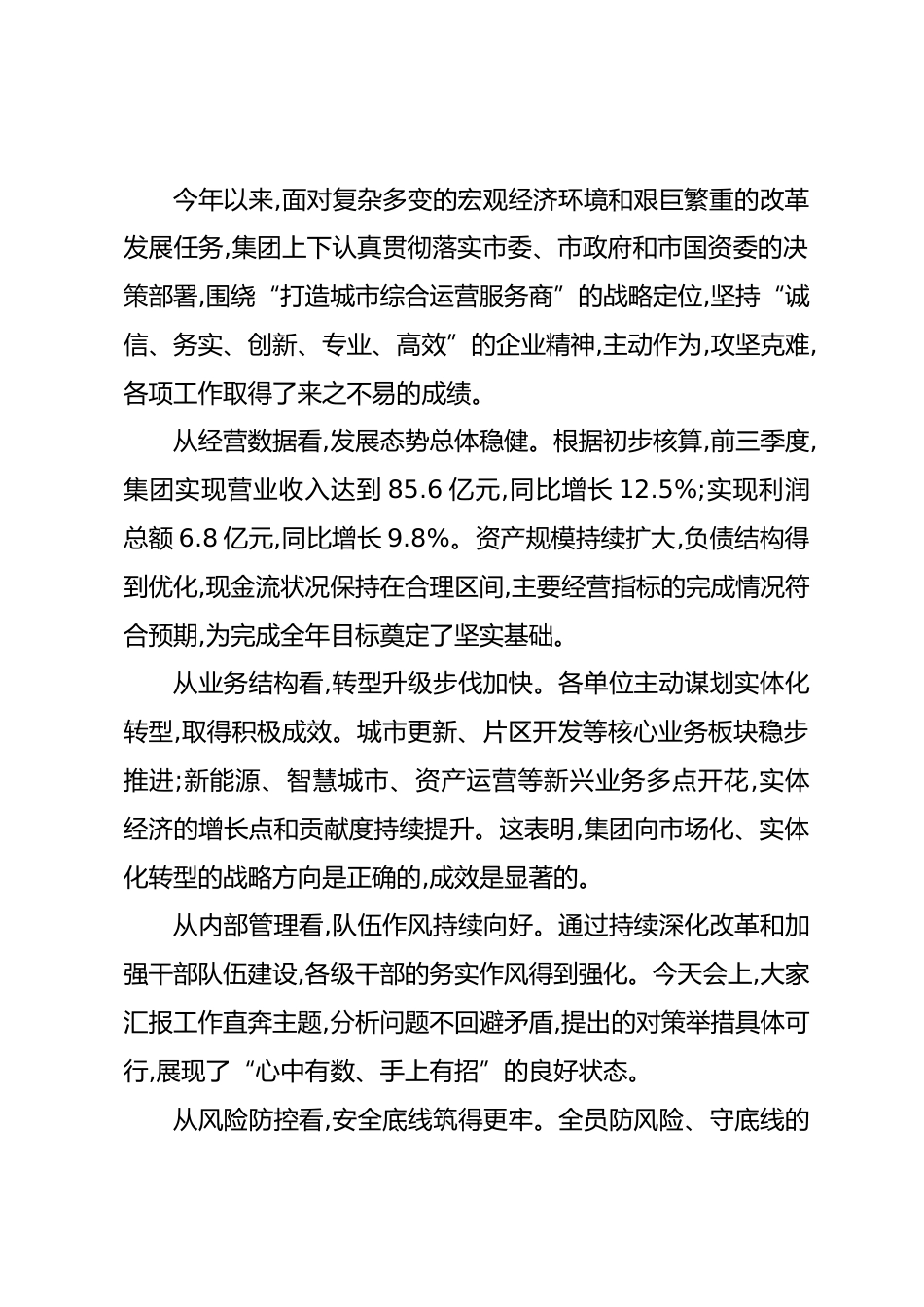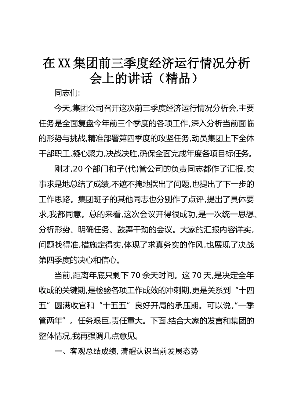 在XX集團(tuán)前三季度經(jīng)濟(jì)運(yùn)行情況分析會(huì)上的講話(精品)同志們:今天,集團(tuán)公司召開這次前三季度經(jīng)濟(jì)運(yùn)行情況分析會(huì),主要任務(wù)是全面復(fù)盤今年前三個(gè)季度的各項(xiàng)工作,深入分析當(dāng)前面臨的形勢(shì)與挑戰(zhàn),精準(zhǔn)部署第四季度的攻堅(jiān)任務(wù),動(dòng)員集團(tuán)上下全體干部職工,凝心聚力,決戰(zhàn)決勝,確保全面完成年度各項(xiàng)目標(biāo)任務(wù)。剛才,20個(gè)部門和子(代)管公司的負(fù)責(zé)同志都作了匯報(bào),實(shí)事求是地總結(jié)了成績(jī),不遮不掩地?cái)[出了問題,也提出了下一步的工作思路。集團(tuán)班子的其他同志也分別作了點(diǎn)評(píng),提出了具體要求,我都同意??偟膩砜?這次會(huì)議開得很成功,是一次統(tǒng)一思想、分析形勢(shì)、明確任務(wù)、鼓舞干勁的會(huì)議...