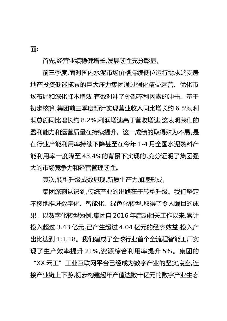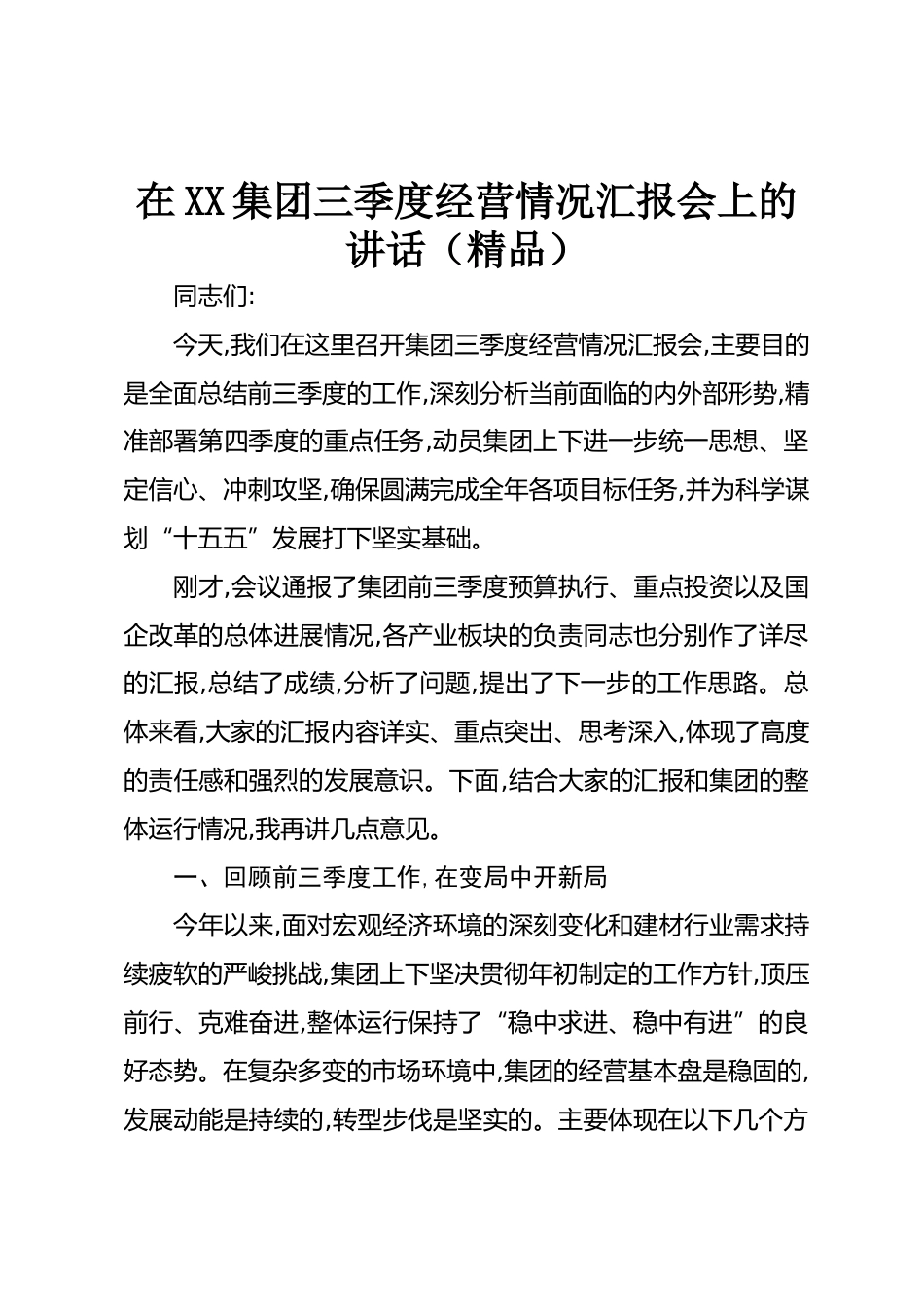 在XX集團三季度經(jīng)營情況匯報會上的講話(精品)同志們:今天,我們在這里召開集團三季度經(jīng)營情況匯報會,主要目的是全面總結(jié)前三季度的工作,深刻分析當前面臨的內(nèi)外部形勢,精準部署第四季度的重點任務,動員集團上下進一步統(tǒng)一思想、堅定信心、沖刺攻堅,確保圓滿完成全年各項目標任務,并為科學謀劃“十五五”發(fā)展打下堅實基礎(chǔ)。剛才,會議通報了集團前三季度預算執(zhí)行、重點投資以及國企改革的總體進展情況,各產(chǎn)業(yè)板塊的負責同志也分別作了詳盡的匯報,總結(jié)了成績,分析了問題,提出了下一步的工作思路??傮w來看,大家的匯報內(nèi)容詳實、重點突出、思考深入,體現(xiàn)了高度的責任感和強...