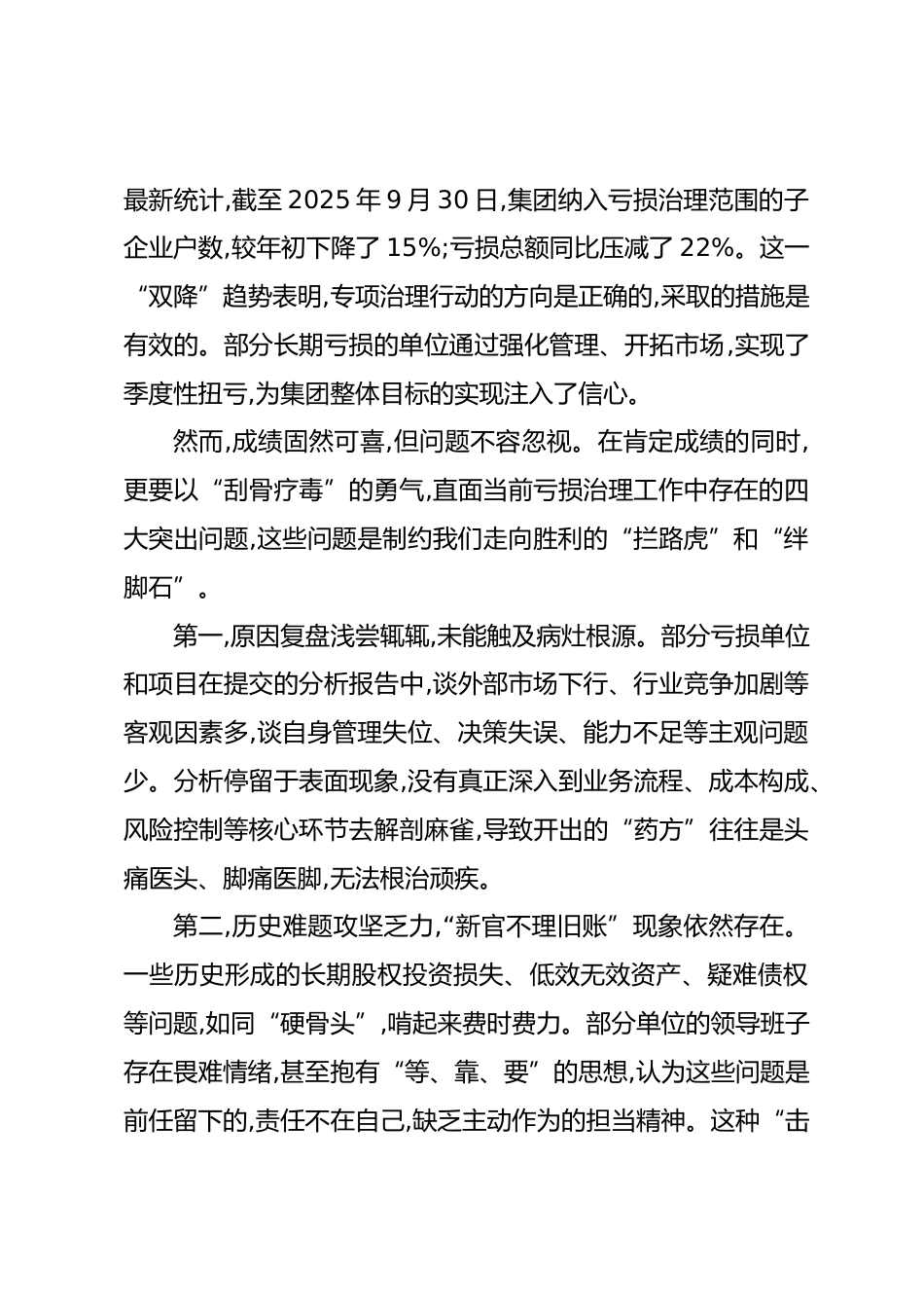 在XX建投集團(tuán)虧損治理2025年三季度總結(jié)推進(jìn)會上的講話(精品)同志們:今天召開這次集團(tuán)虧損治理三季度總結(jié)推進(jìn)會,主要任務(wù)是深入貫徹落實(shí)上級主管單位關(guān)于虧損企業(yè)治理的決策部署,系統(tǒng)總結(jié)前三季度的工作成效,深刻剖析當(dāng)前存在的痛點(diǎn)與難點(diǎn),并對第四季度的決戰(zhàn)決勝階段進(jìn)行全面動員和部署。自年初啟動虧損治理專項(xiàng)行動以來,集團(tuán)上下付出了艱辛努力,也取得了來之不易的階段性成果。但必須清醒地認(rèn)識到,虧損治理是一場關(guān)乎集團(tuán)生存與發(fā)展的硬仗,是一場必須打贏的攻堅(jiān)戰(zhàn)。當(dāng)前的工作距離實(shí)現(xiàn)高質(zhì)量發(fā)展的根本目標(biāo),距離徹底扭轉(zhuǎn)被動局面,仍有相當(dāng)大的差距。今天的會議,既是總...