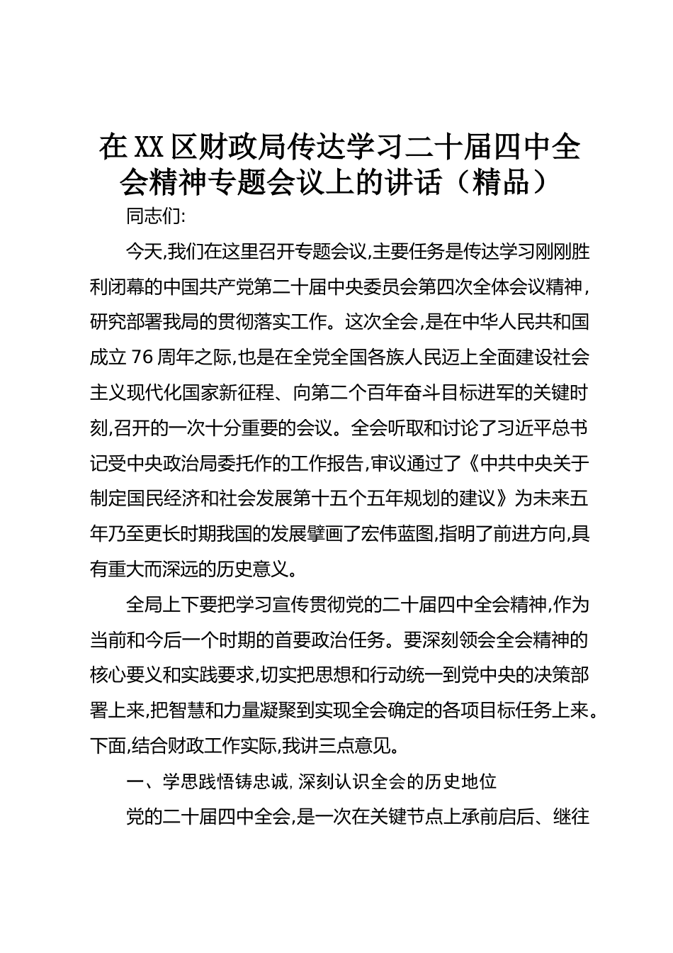 在XX區(qū)財政局傳達(dá)學(xué)習(xí)二十屆四中全會精神專題會議上的講話(精品)