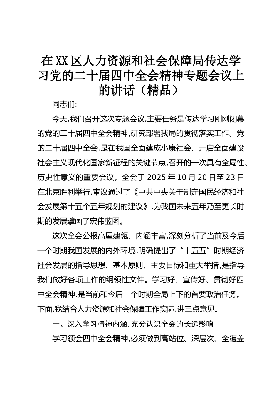 在XX區(qū)人力資源和社會(huì)保障局傳達(dá)學(xué)習(xí)黨的二十屆四中全會(huì)精神專題會(huì)議上的講話(精品)同志們:今天,我們召開這次專題會(huì)議,主要任務(wù)是傳達(dá)學(xué)習(xí)剛剛閉幕的黨的二十屆四中全會(huì)精神,研究部署我局的貫徹落實(shí)工作。黨的二十屆四中全會(huì),是在我國(guó)全面建成小康社會(huì)、開啟全面建設(shè)社會(huì)主義現(xiàn)代化國(guó)家新征程的關(guān)鍵節(jié)點(diǎn),召開的一次具有全局性、歷史性意義的重要會(huì)議。全會(huì)于2025年10月20日至23日在北京勝利舉行,審議通過了《中共中央關(guān)于制定國(guó)民經(jīng)濟(jì)和社會(huì)發(fā)展第十五個(gè)五年規(guī)劃的建議》,為我國(guó)未來五年乃至更長(zhǎng)時(shí)期的發(fā)展擘畫了宏偉藍(lán)圖。這次全會(huì)公報(bào)高屋建瓴、內(nèi)涵豐富,深刻分析了...