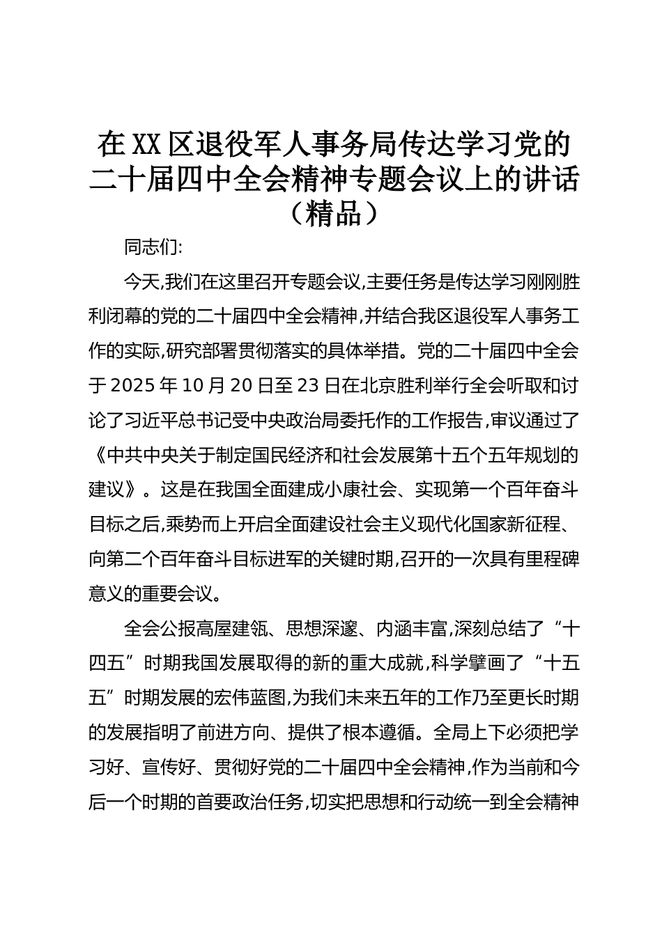 在XX區(qū)退役軍人事務局傳達學習黨的二十屆四中全會精神專題會議上的講話(精品)同志們:今天,我們在這里召開專題會議,主要任務是傳達學習剛剛勝利閉幕的黨的二十屆四中全會精神,并結合我區(qū)退役軍人事務工作的實際,研究部署貫徹落實的具體舉措。黨的二十屆四中全會于2025年10月20日至23日在北京勝利舉行全會聽取和討論了習近平總書記受中央政治局委托作的工作報告,審議通過了《中共中央關于制定國民經(jīng)濟和社會發(fā)展第十五個五年規(guī)劃的建議》。這是在我國全面建成小康社會、實現(xiàn)第一個百年奮斗目標之后,乘勢而上開啟全面建設社會主義現(xiàn)代化國家新征程、向第二個百年奮斗目標...